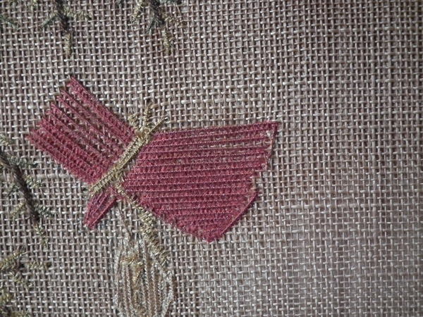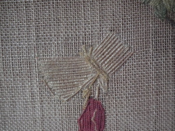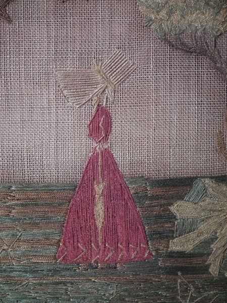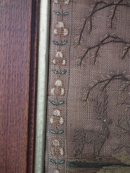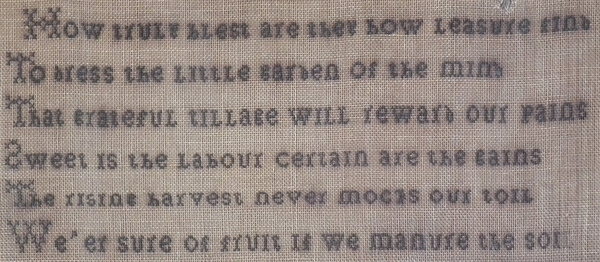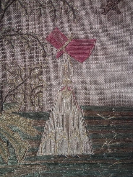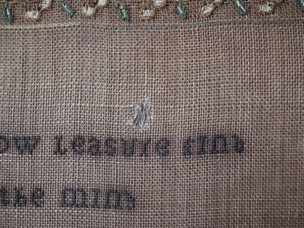 The sampler is worked in a silk thread on canvas ground, in a variety of stitches.