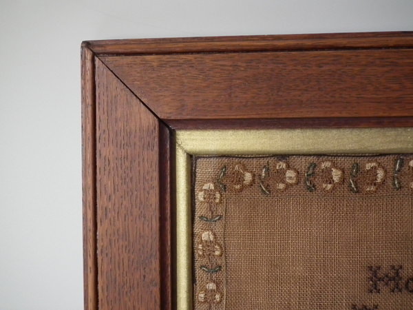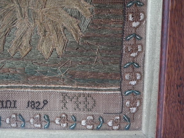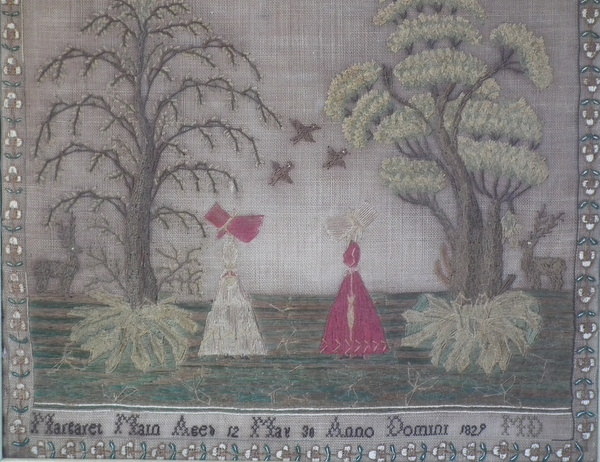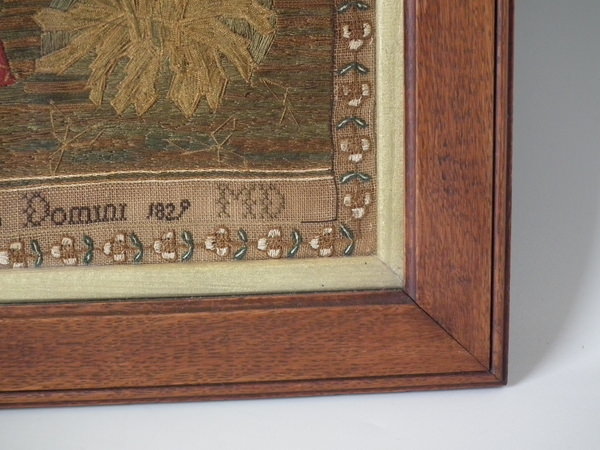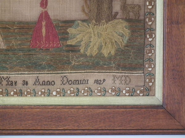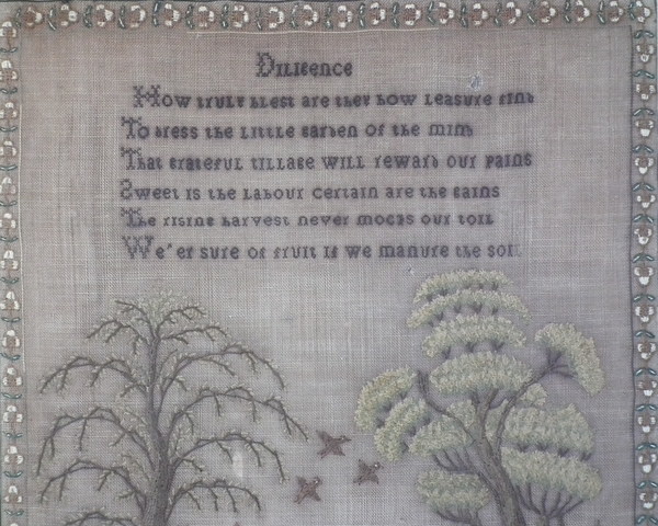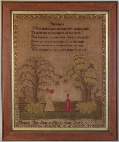 George IV, dated May 30 1829. 21ins by 17ins wide. 1829 'Diligence' Sampler by Margaret Main. Framed in an old wood frame with gilt slip and glass.