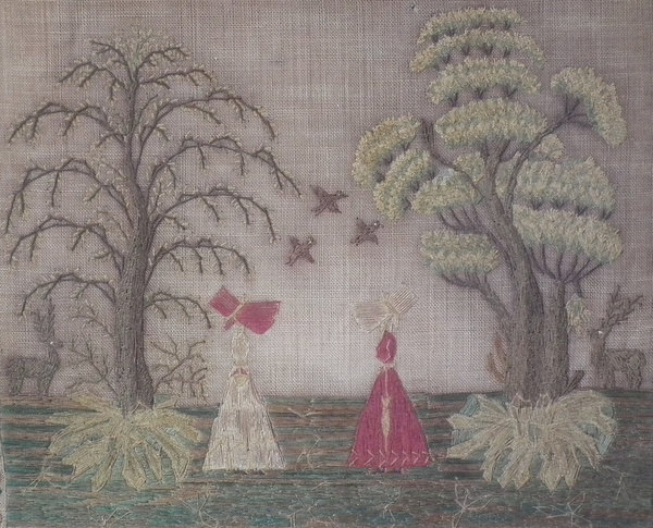 A central picture of two girls in bonnets, one with a parosol, standing between two trees.