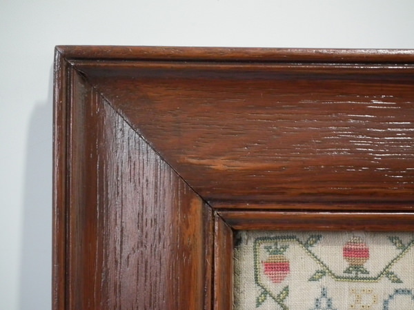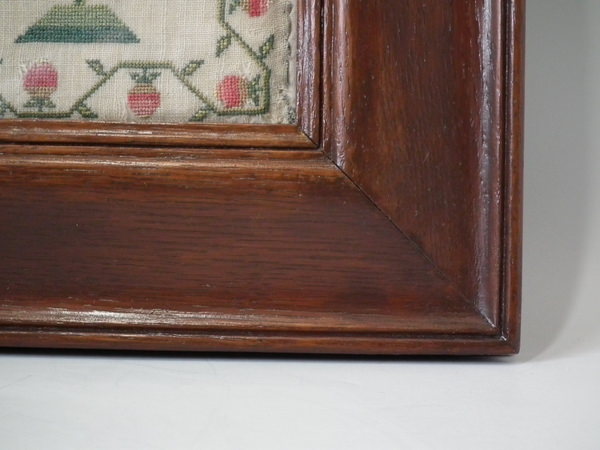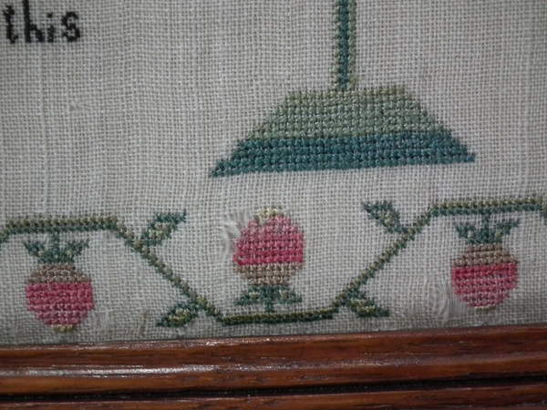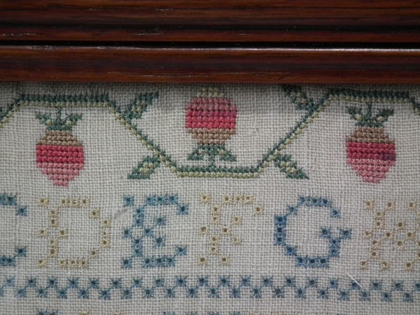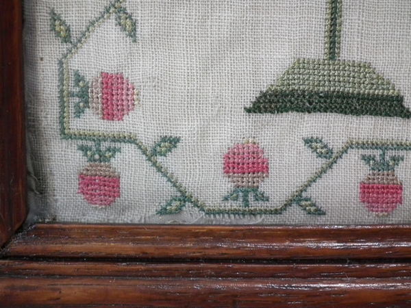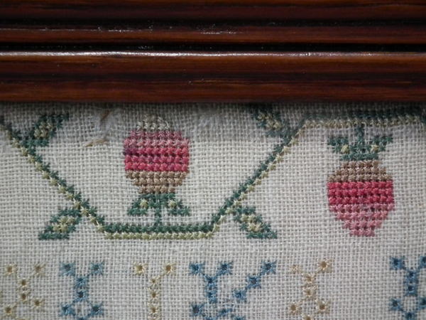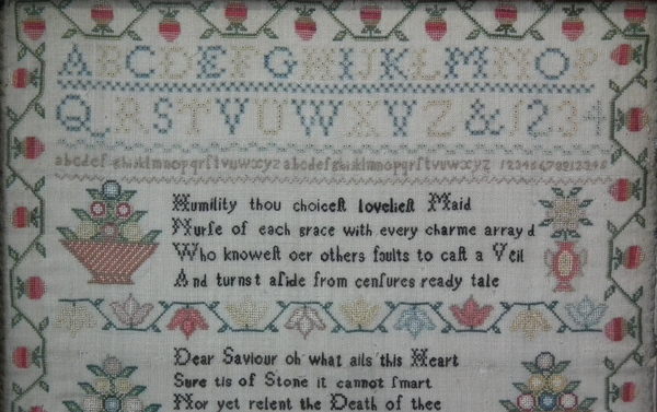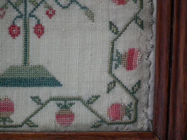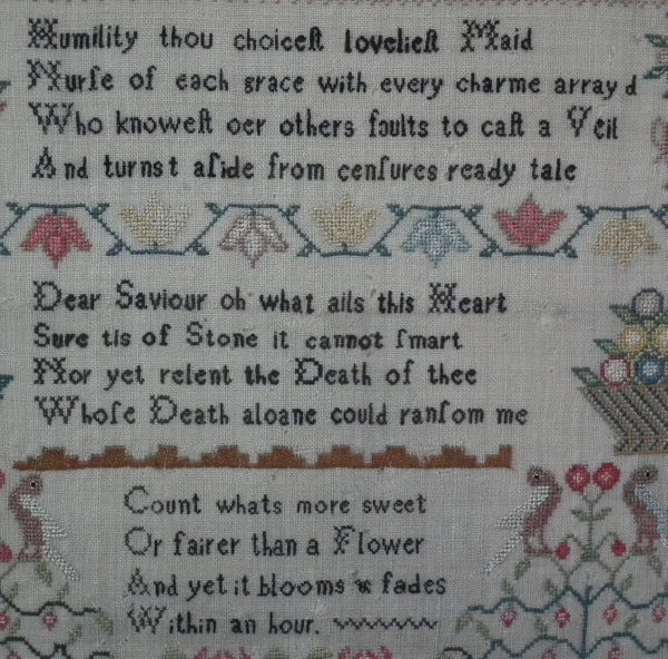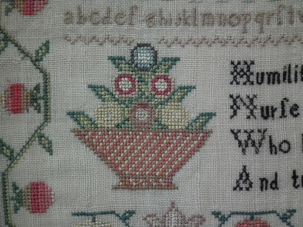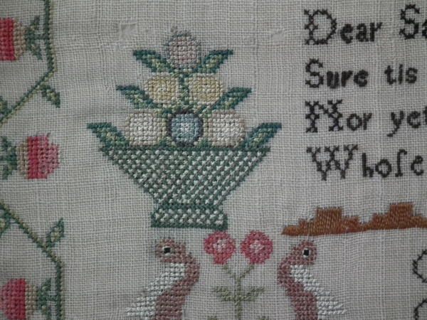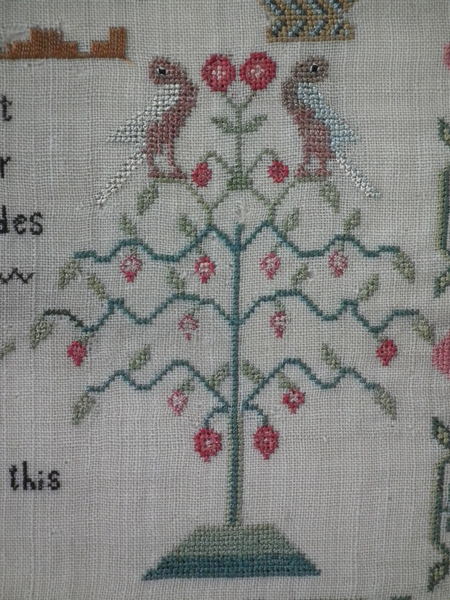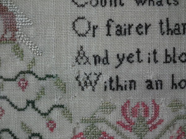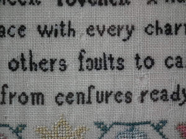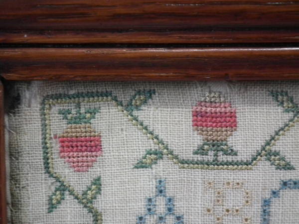 The sampler is worked in silk on linen ground, in a variety of stitches including Algerian eye.