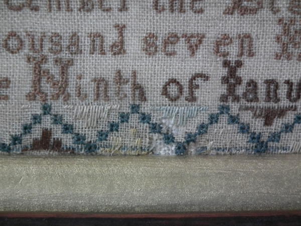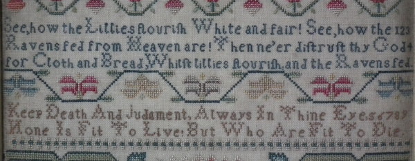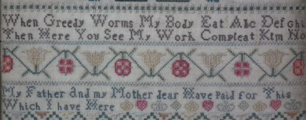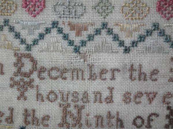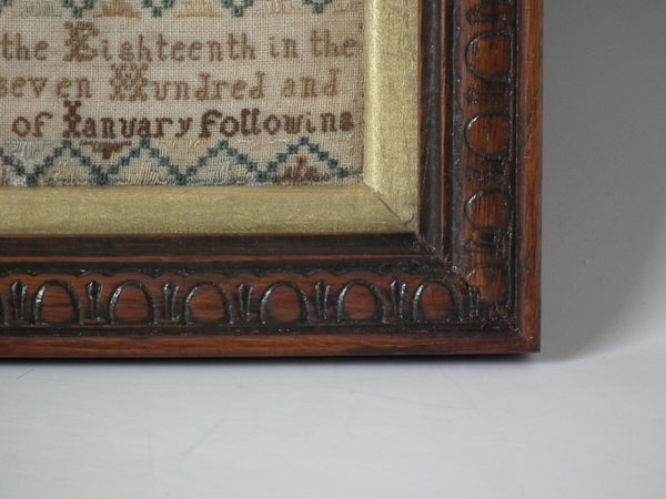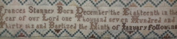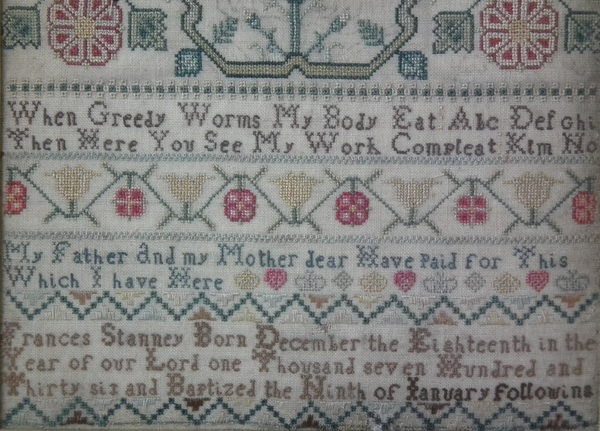 Circa 1745. 12ins by 8.25ins wide. Circa 1745 Sampler by Frances Stanney.