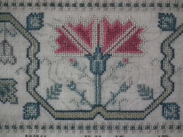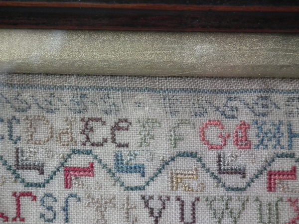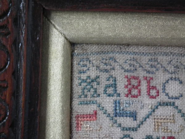 The sampler is worked in silk on linen ground, in a variety of stitches.