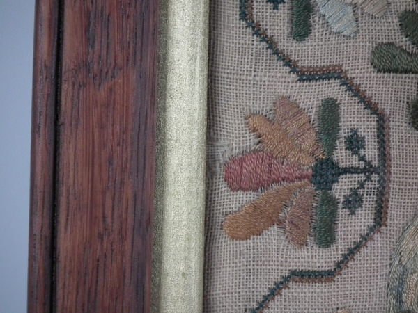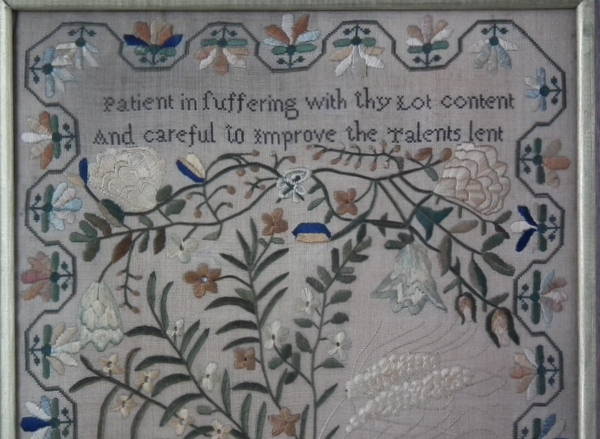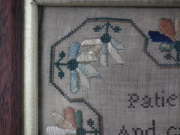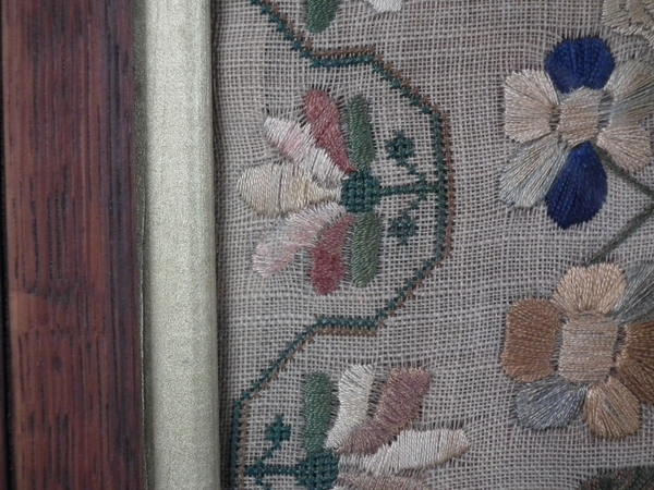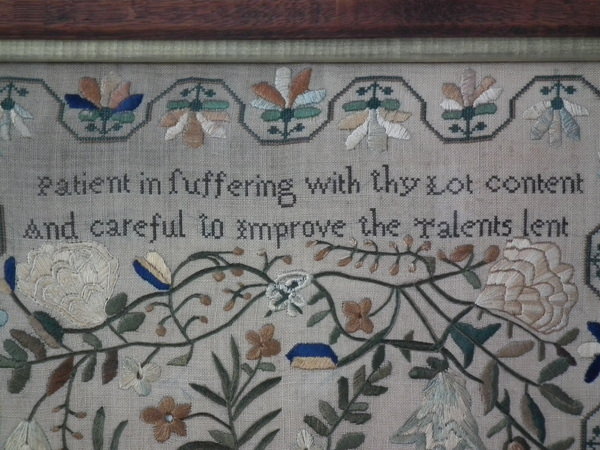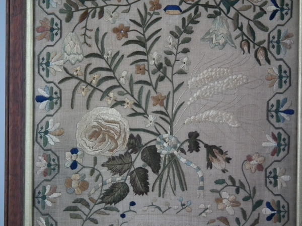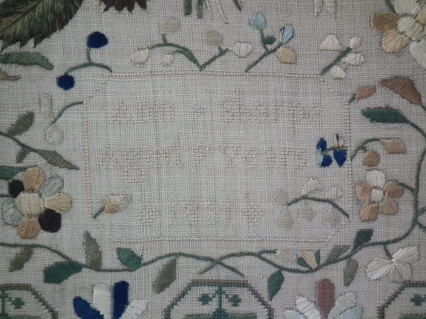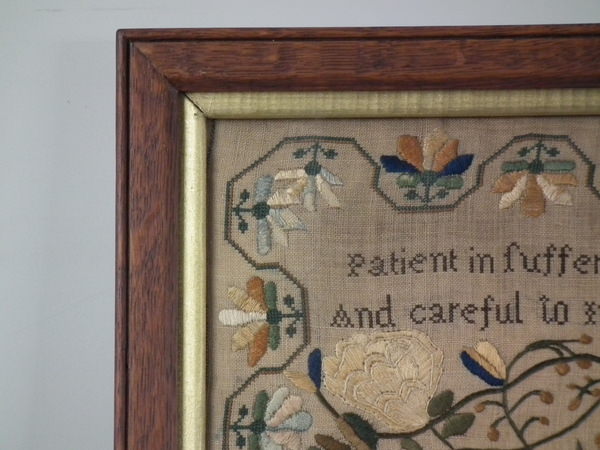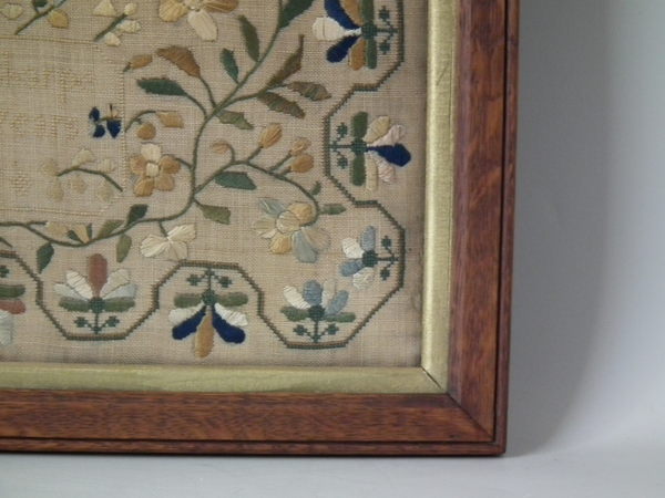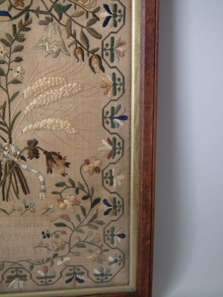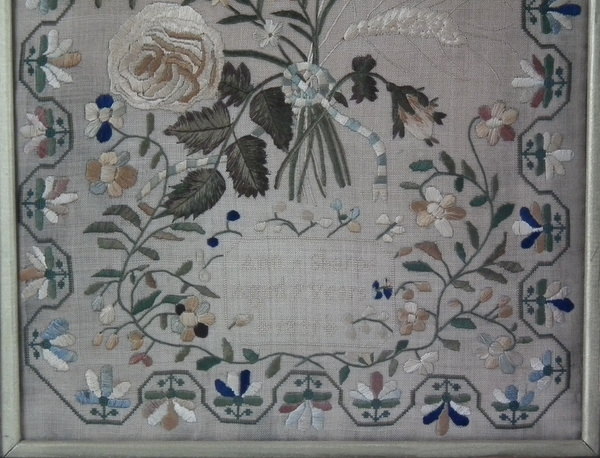 William IV, dated 1831. 20ins high by 12.5ins wide. 1831 Floral Sampler by Ann Sharpe. Framed in an old wood frame with gilt slip and glass.