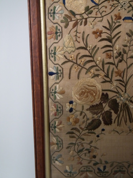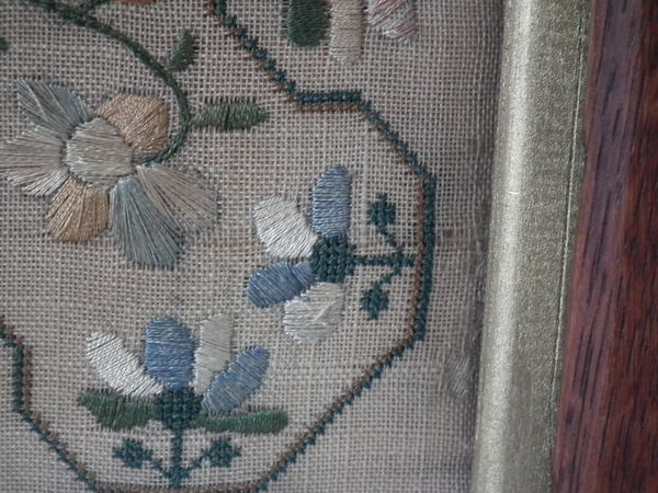 The sampler is worked in silk on linen ground, in a variety of stitches. Meandering floral border. Colours greens, navy blue, pale blue, dark brown, copper, gold and black.