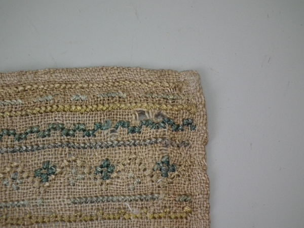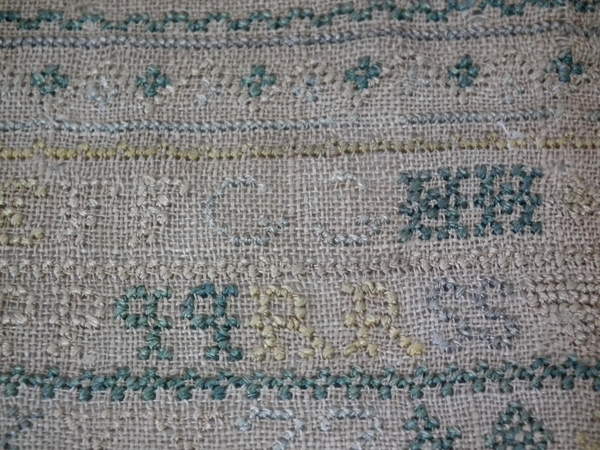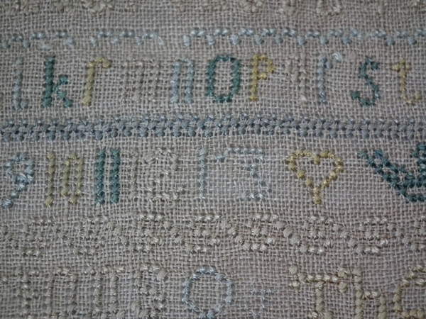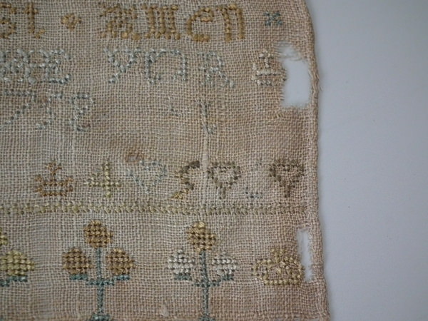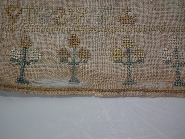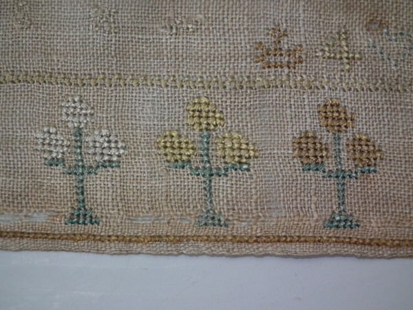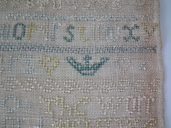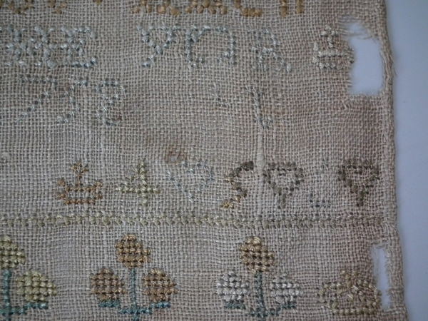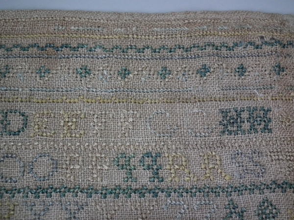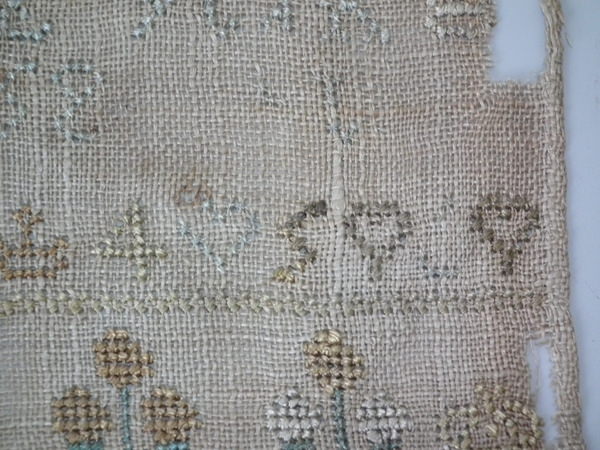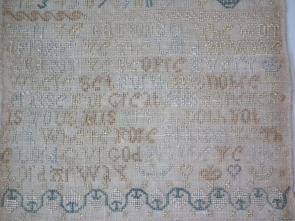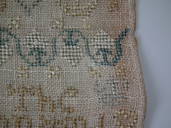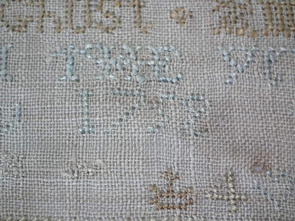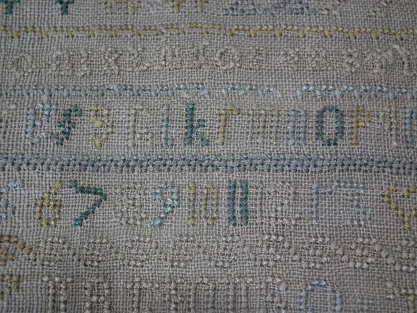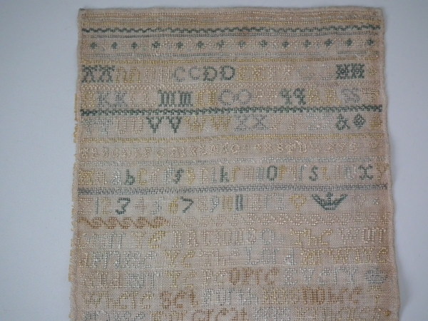 Unframed. The sampler is worked in silk on linen ground, in cross stitch throughout.