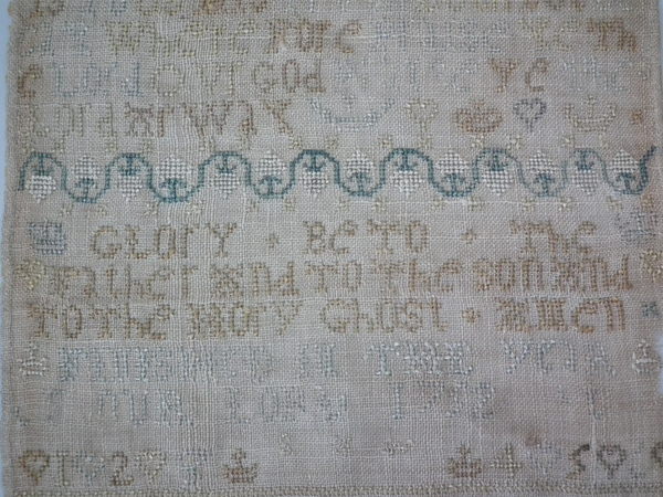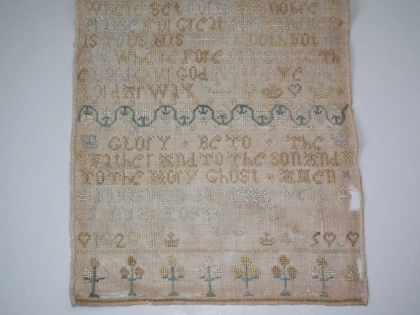 George II, dated 1752. 16.5ins by 8.25ins wide. 1752 religious verse sampler.