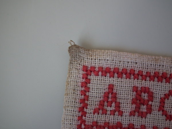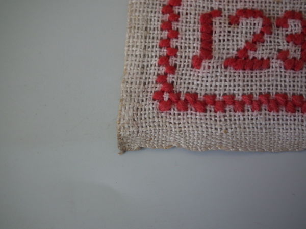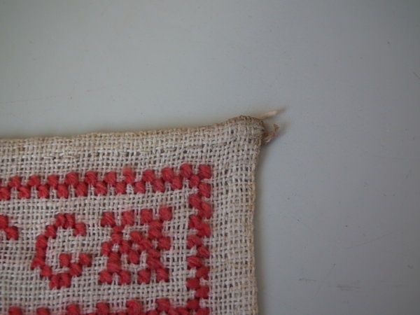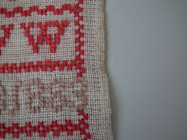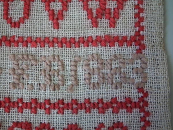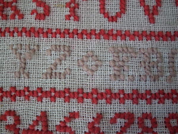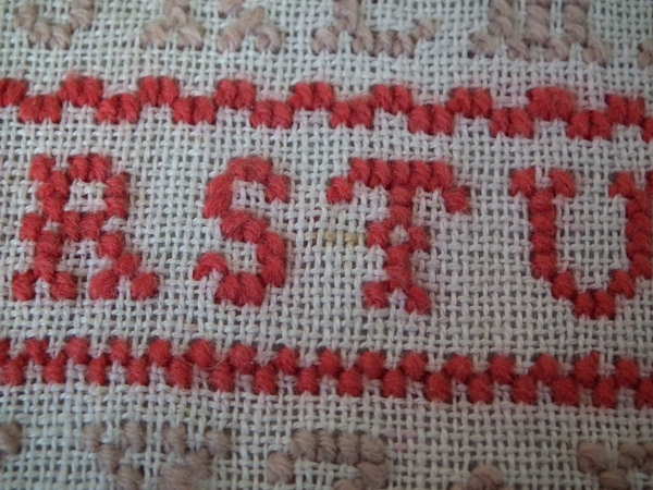 The sampler is worked in wool on canvas ground, in cross stitch throughout. Zig zag border. Colours red and light brown.