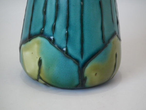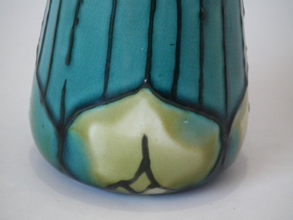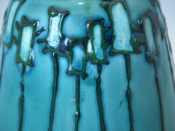 Minton Secessionist vase decorated with stylised flowers, green and black tube lining, on turquoise and green ground.