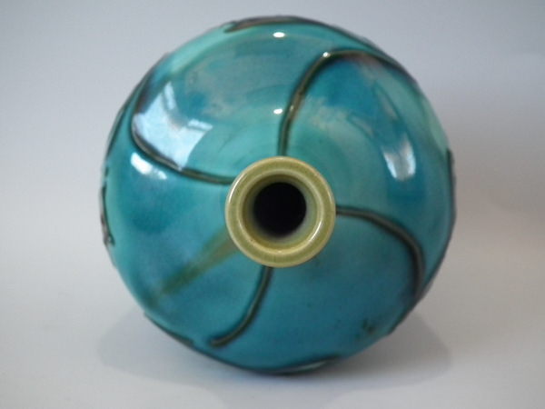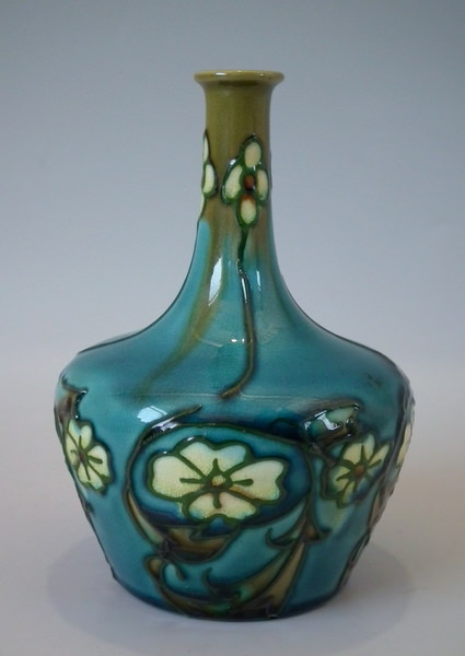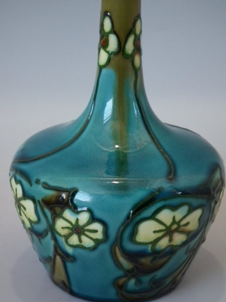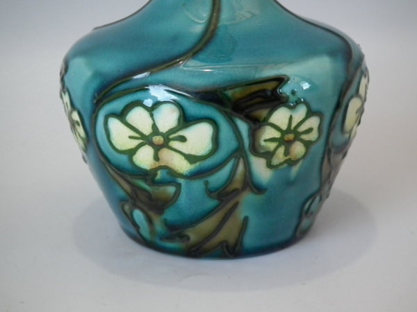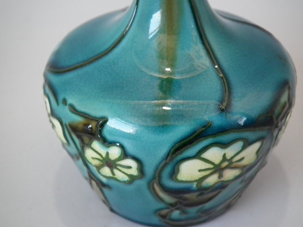 Minton Secessionist fluted vase decorated with stylized cream flowers and leaves, with green tube lining, on turquoise ground.