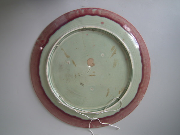 Circa 1910. 16ins diameter. Large Mintons Secessionist No.3 charger. Green and pink ground with black tube lining. Stylised flowers in a typical Art Nouveau design.