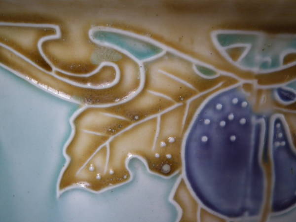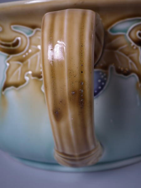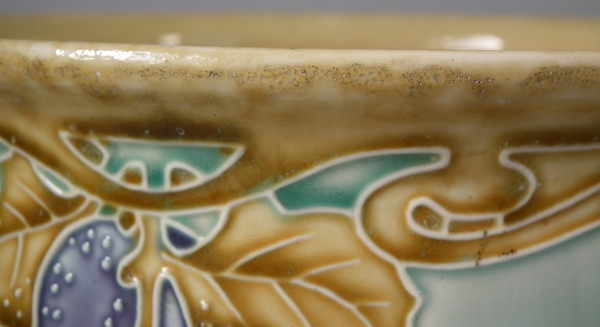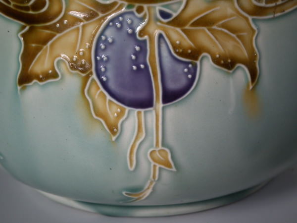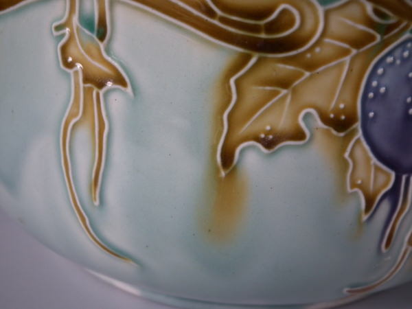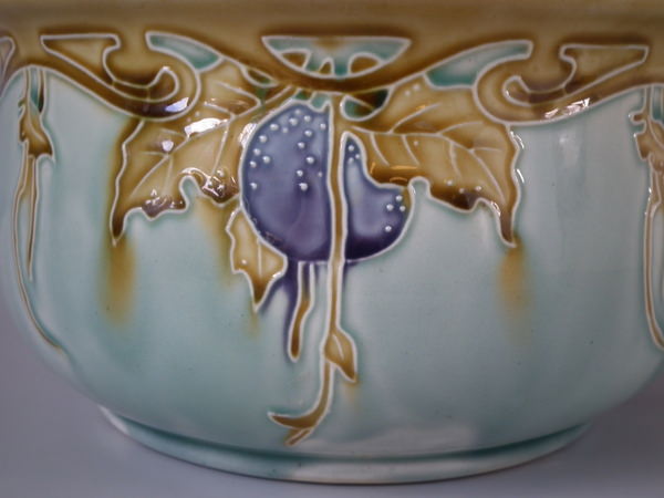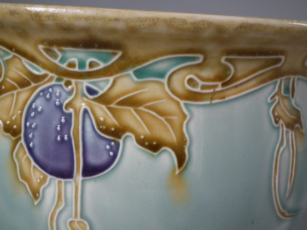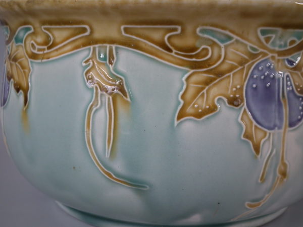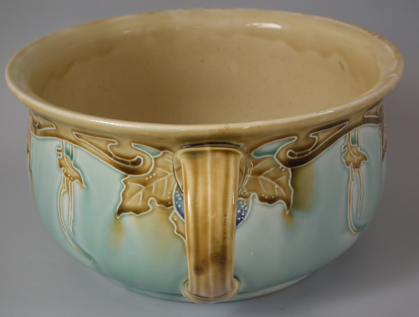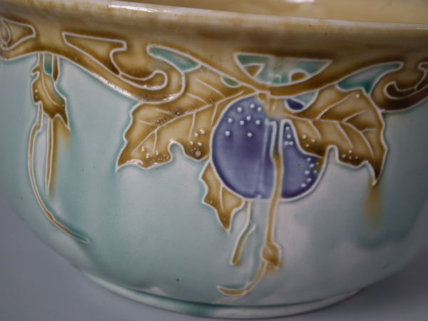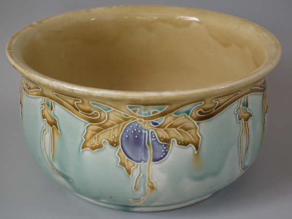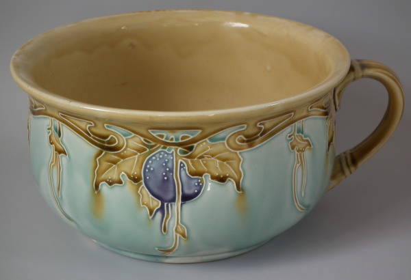 Circa 1902. 9.25ins diameter, 5ins high. Minton Secessionist chamber pot decorated with fruits and leaves glazed in purple, turquoise and green. Cream tube lining. Yellow interior and cream underside.