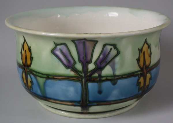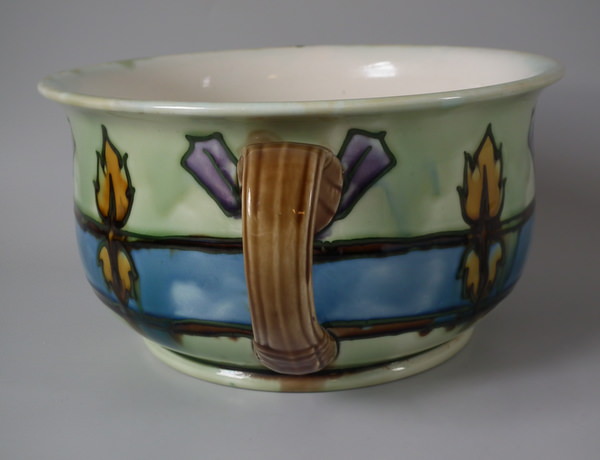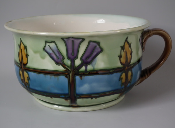 Circa 1905. 4.75ins high, 10.25ins wide. Minton Secessionist No.11 chamber pot. Decorated with stylized floral motifs glazed in blue, turquoise, purple, green, brown and ochre. Green tube lining. Cream interior and underside.