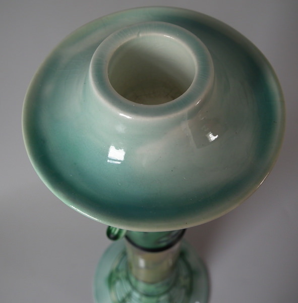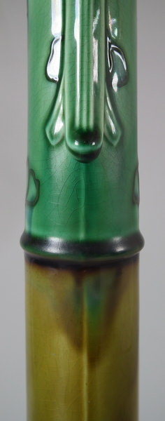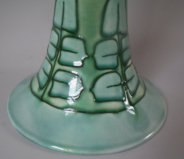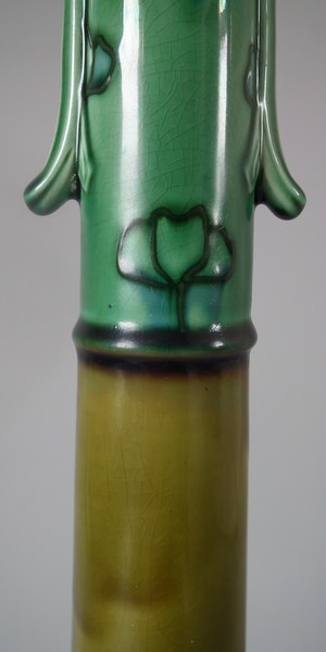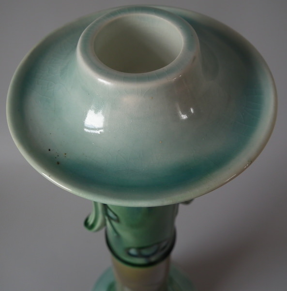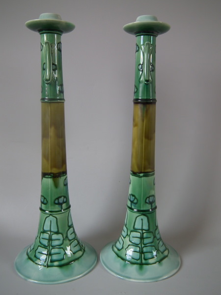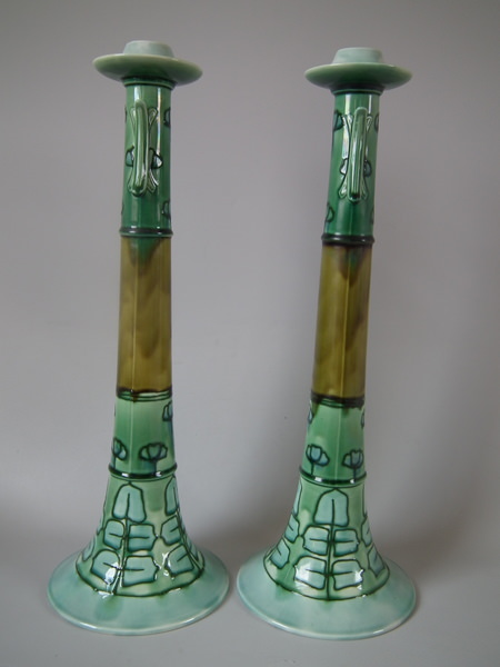 Circa 1905. 20ins high, 7ins wide. Pair Minton Secessionist Art Nouveau style candlesticks, decorated with stylised flowers and leaves. Blue and green glazes with dark green tube linings.