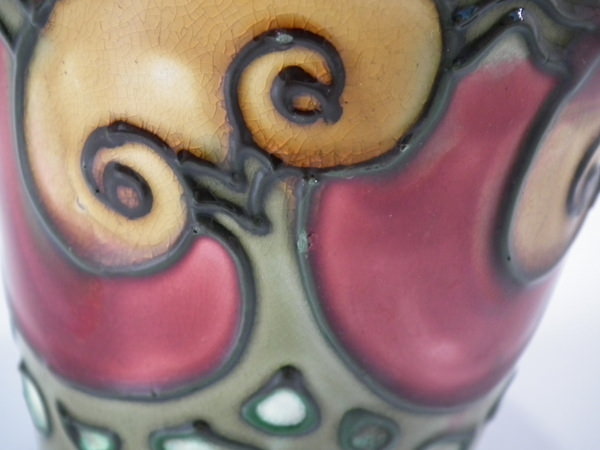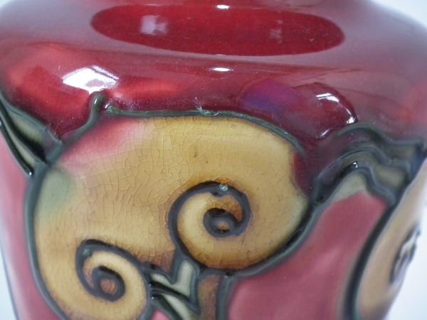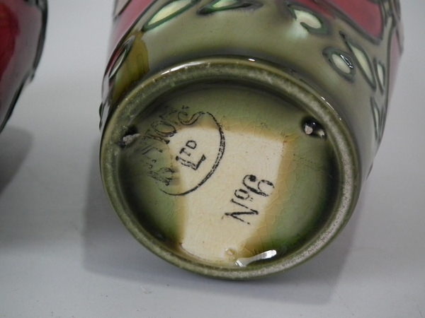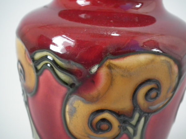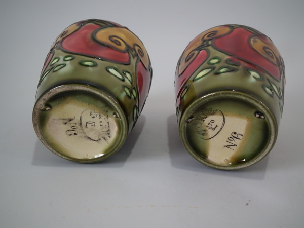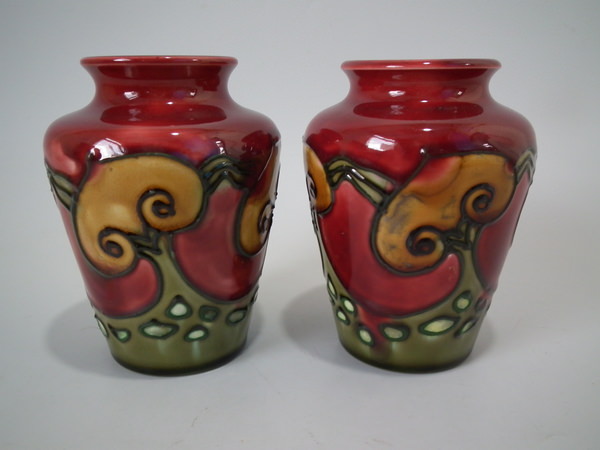 Circa 1910. 4.25ins high. Pair small Minton Secessionist no.6 vases, decorated with stylised ochre flowers with green tube lining, on deep red ground.