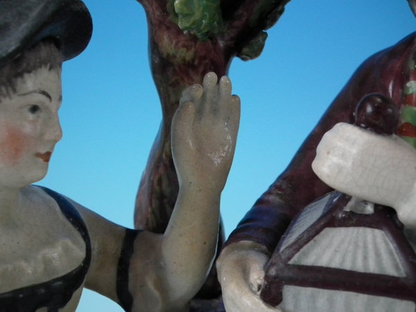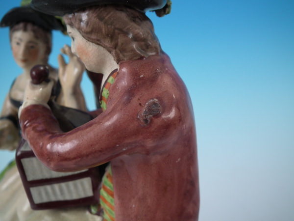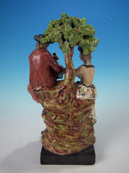 pre-Victorian, circa 1820. 12.8ins high, 5.5ins wide, 4.7ins depth. Staffordshire pearlware bocage figure with a occupational theme which features a bird catcher and a lady by a stream, seated on a square base.