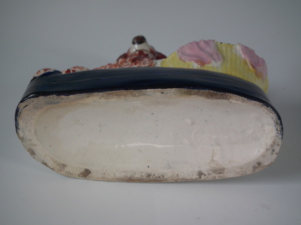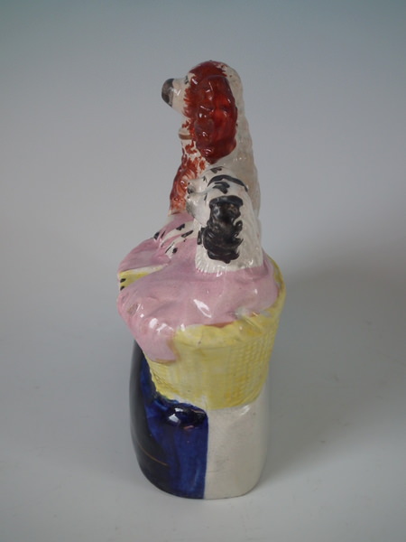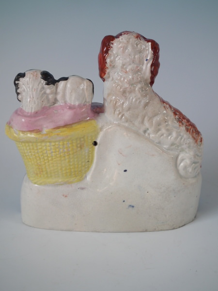 Victorian, circa 1860. 5.7ins high, 5.6ins wide, 2.4ins depth. Staffordshire group which features a spaniel and her pups in a wicker wash basket, seated on an oval base.