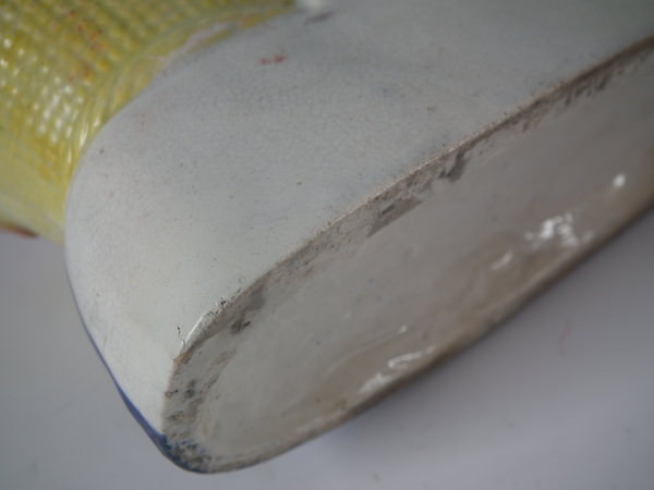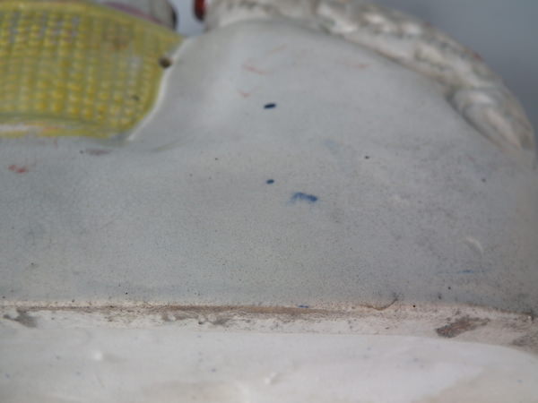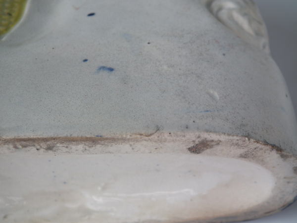 KILN EFFECTS: small firing hole to rim of wash basket and under spaniel's front leg.
