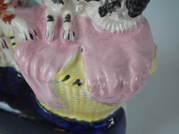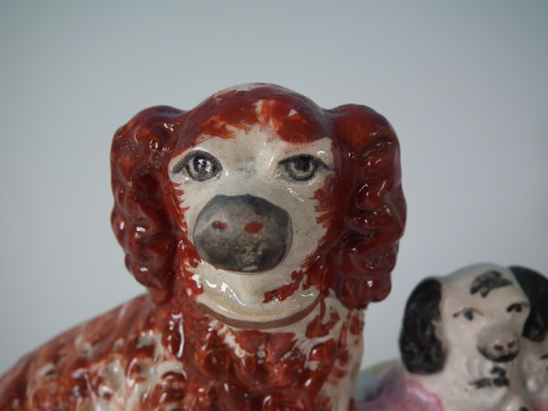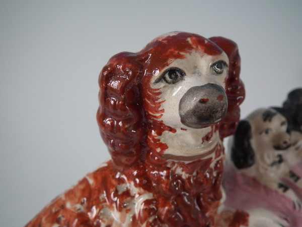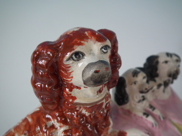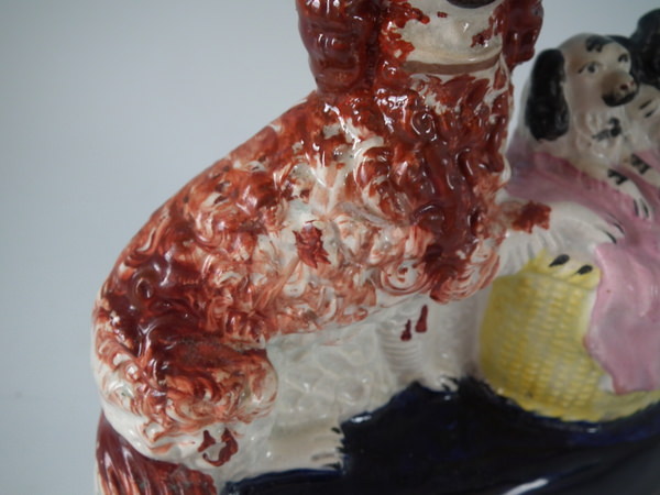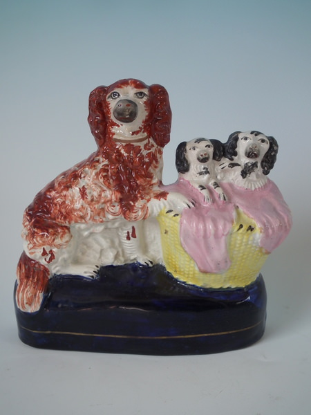 Staffordshire spaniel & pups in wash basket figure group