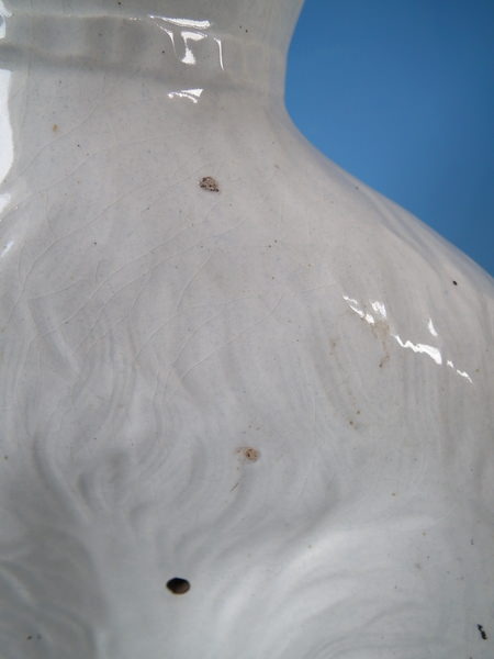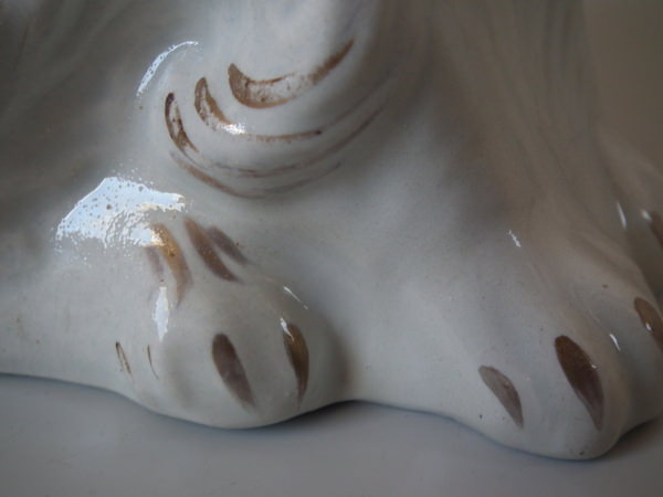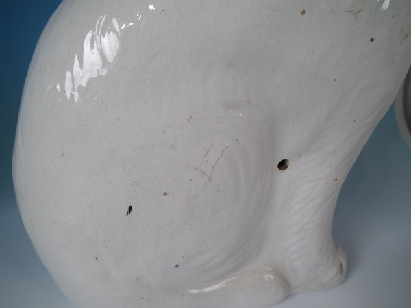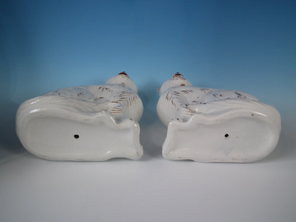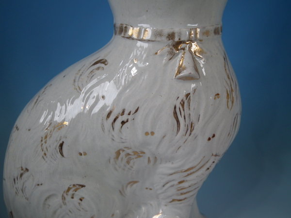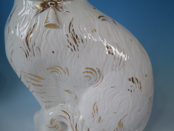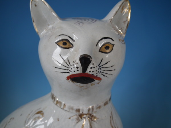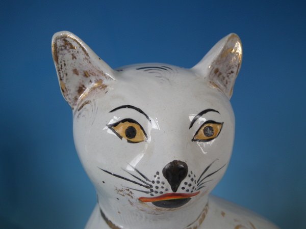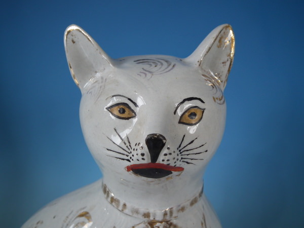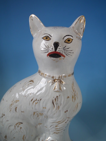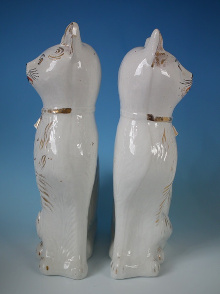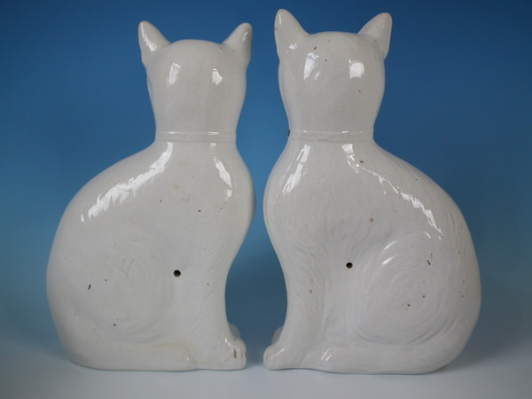 Victorian, circa 1890. Tallest is 13.2ins high, 8.1ins wide, 3.9ins depth. Pair of Staffordshire figures which feature a cat, seated directly on the ground, no base.