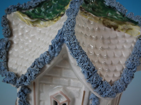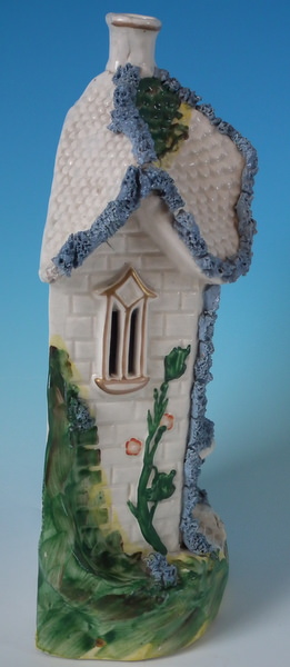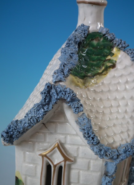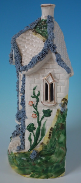 Victorian, circa 1860. 11.2ins high, 6.4ins wide, 3.8ins depth. Staffordshire pastille burner which features a two storey cottage with single chimney, stood on a shaped base. Multi-coloured version. Dull gilt embellishment.