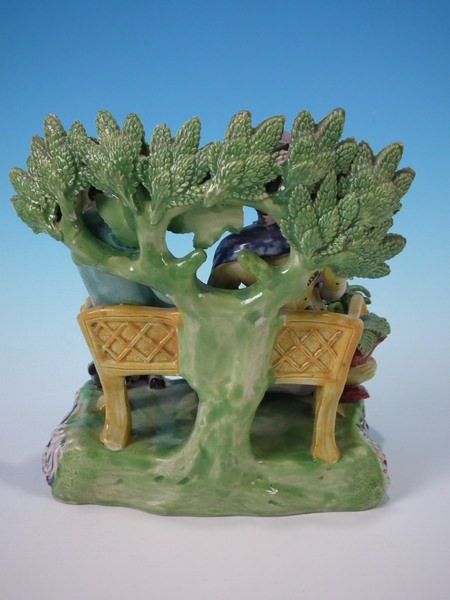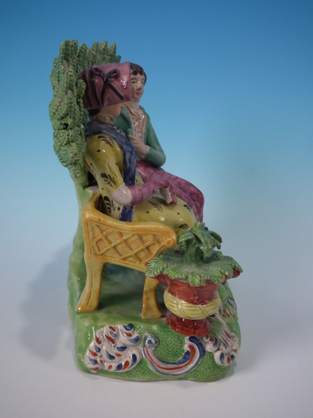pre-Victorian, circa 1820. 7.9ins high, 7.1ins wide, 5.1ins depth. Staffordshire pearlware bocage group which features a couple seated on a bench,