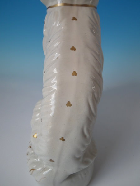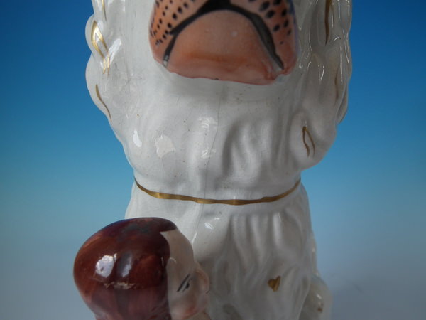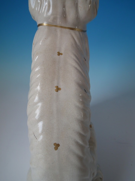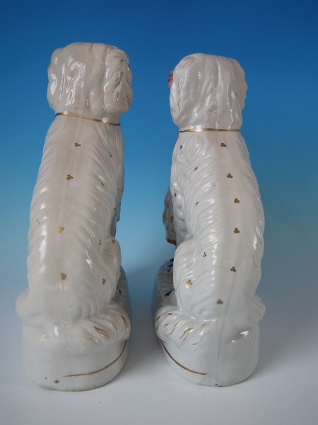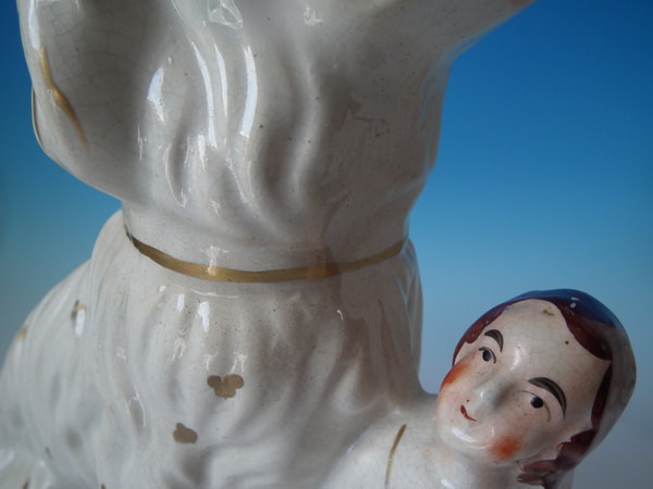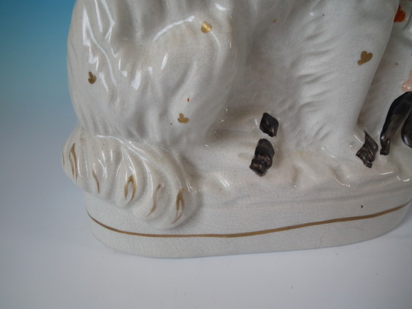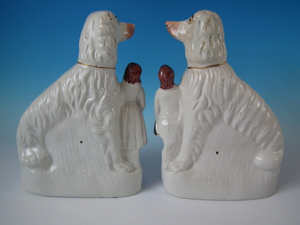 Victorian, circa 1860. Tallest is 13.4ins high, 9.8ins wide, 4.7ins depth. Pair of Staffordshire groups which feature a child stood next to an oversized Afghan hound,