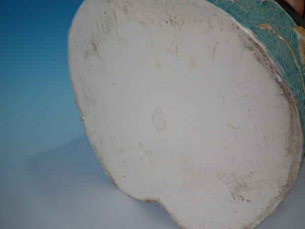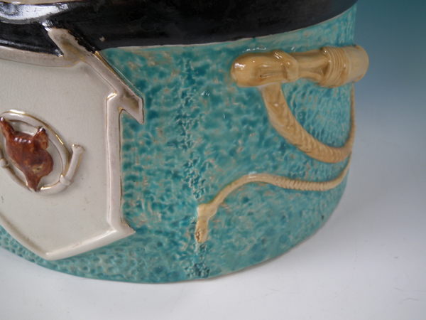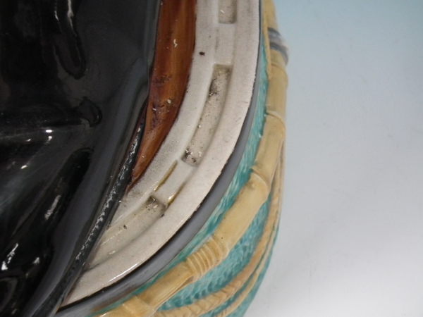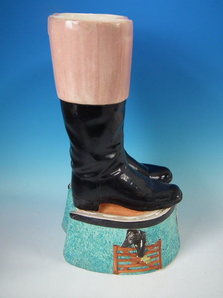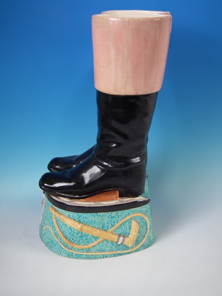 Victorian, circa 1880. 22ins high, 11.8ins wide, 12.2ins depth. Staffordshire stick or whip stand with a hunting theme which features a pair of riding boots stood on a horse shoe,