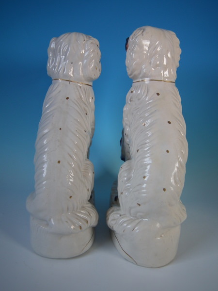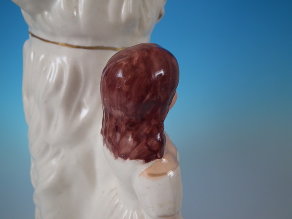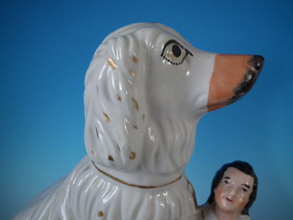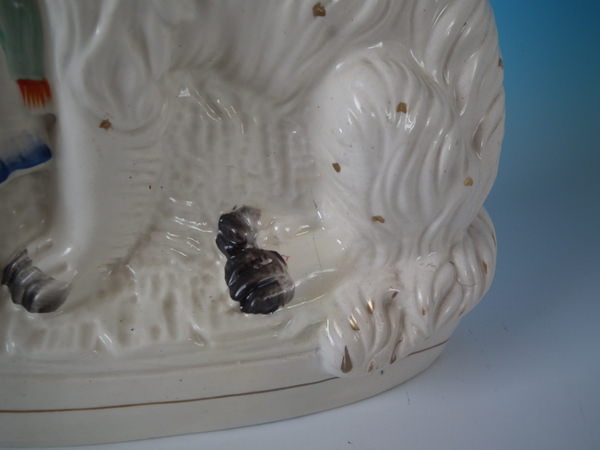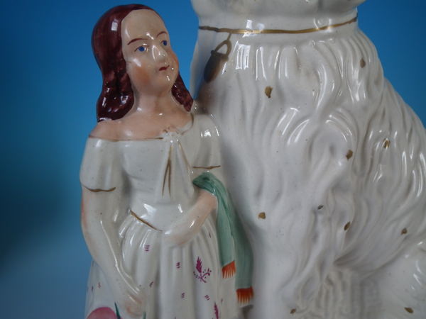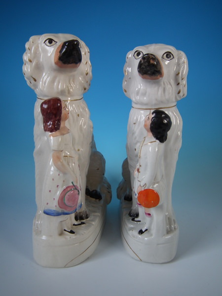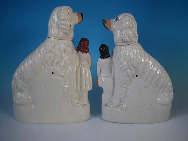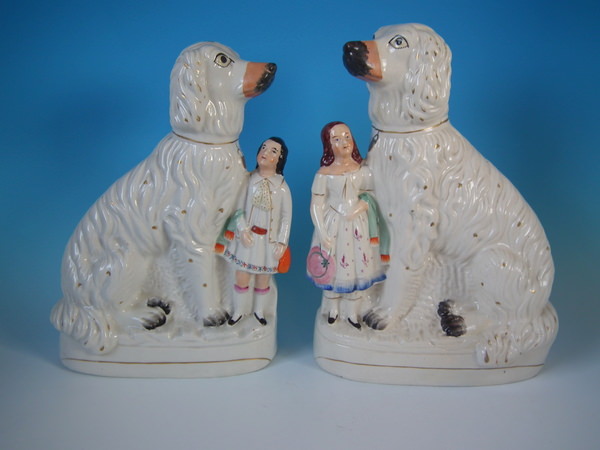 Victorian, circa 1860. Tallest is 13.6ins high, 9.8ins wide, 4.5ins depth. Pair of Staffordshire figures which feature a child stood next to an oversized Afghan hound, seated on a rectangular base.