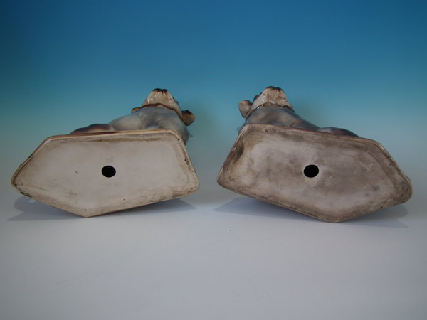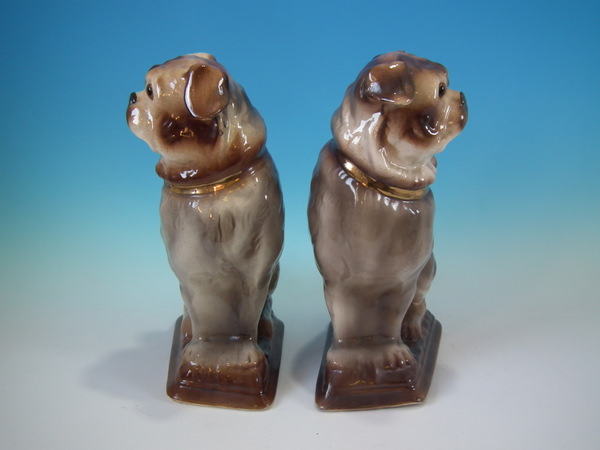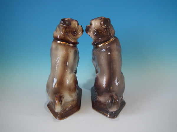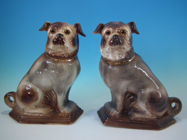 Victorian, circa 1900. Tallest is 12ins high, 9.8ins wide, 4.7ins depth. Pair of Bo'ness Staffordshire figures which feature pugs, seated on a diamond shaped base.
