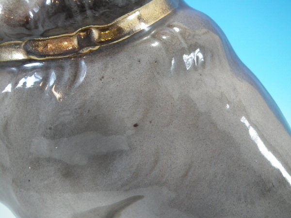CONDITION: Right facing: Good. No restoration. One small flake to top of base and another to tip of dog's left ear.
