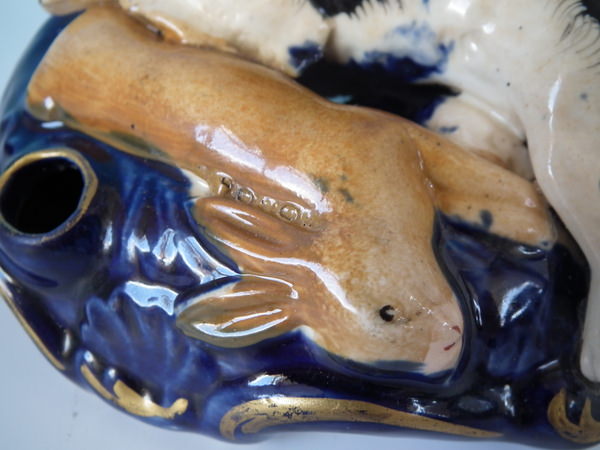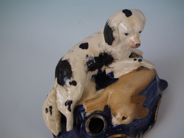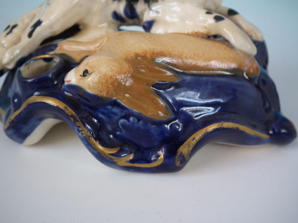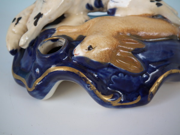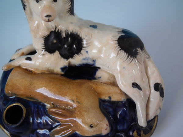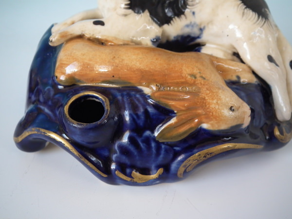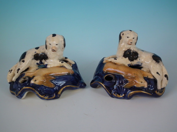Victorian, circa 1860. Tallest is 3.1ins high, 4.5ins wide, 2.8ins depth. Pair of Staffordshire inkwells with a hunting theme which feature a spaniel with hare, recumbent on a shaped base.