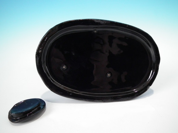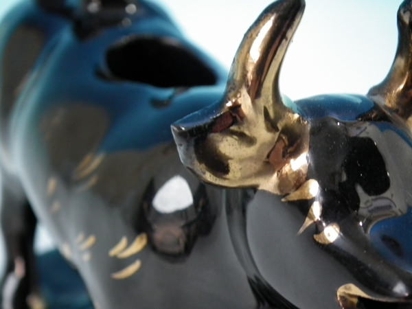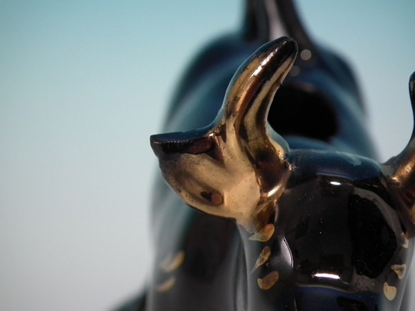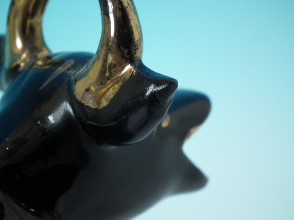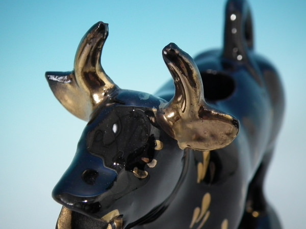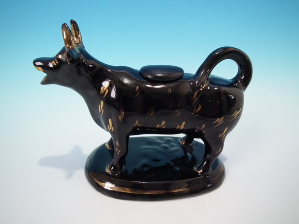 Victorian, circa 1880. 5.5ins high, 7.1ins wide, 3.8ins depth. Staffordshire cow creamer which features a cow, stood on an oval base. Jackfield black version. Bright gilt base line and embellishment.