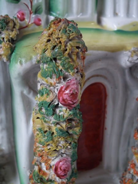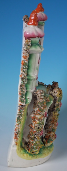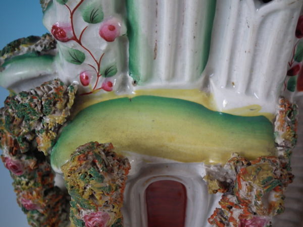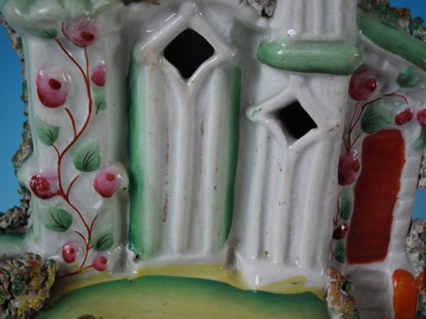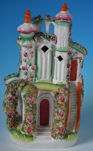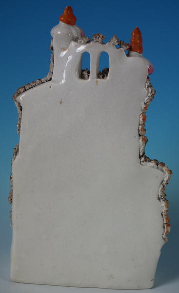 Victorian, circa 1860. 11.4ins high, 7.1ins wide, 3.7ins depth. Staffordshire house which features a house with two turrets, stood on a shaped base. Multi-coloured version. Dull gilt base line and embellishment.