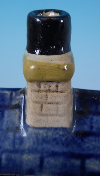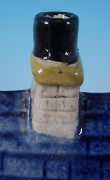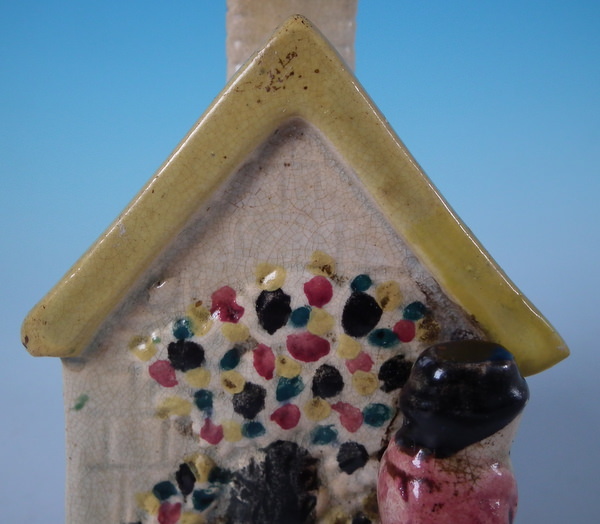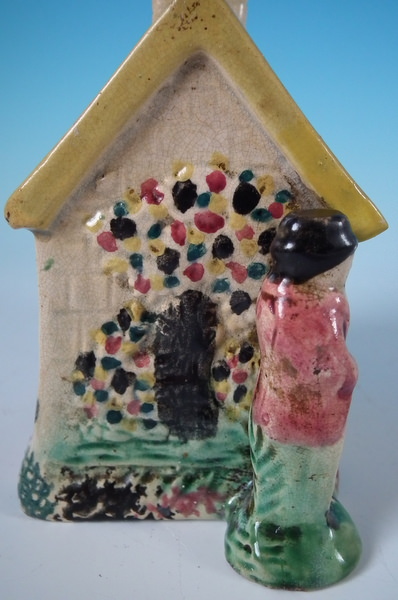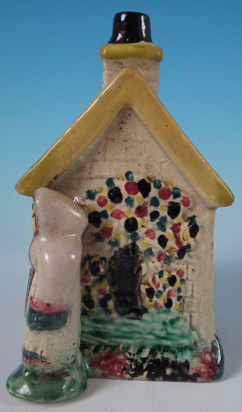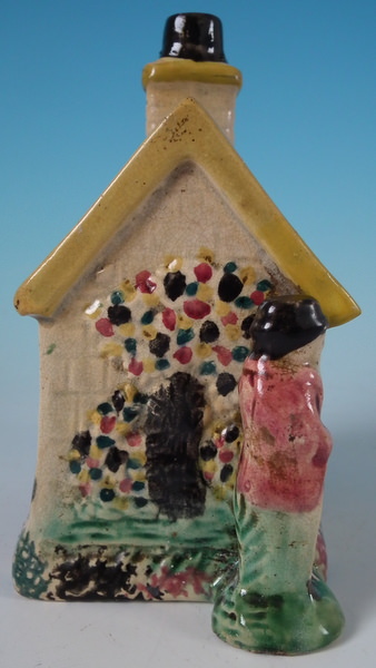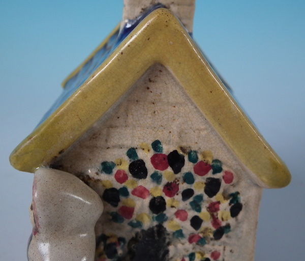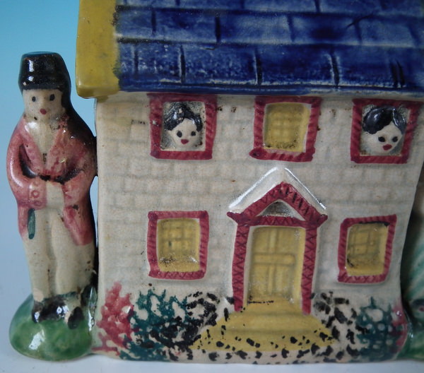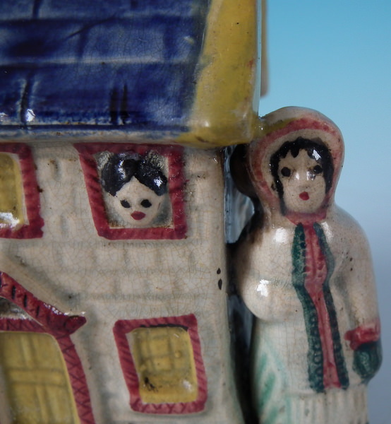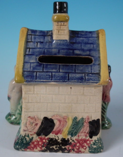 pre-Victorian, circa 1800. 4.9ins high, 4.6ins wide, 2.8ins depth. Staffordshire Prattware money box which features a cottage flanked by a lady and a gentleman, with two children's heads peeping out of the upstairs windows, directly on the ground, no base. Multi-coloured with underglaze blue version.