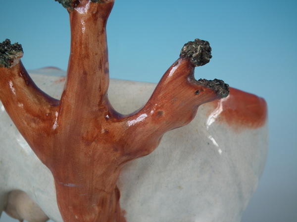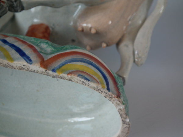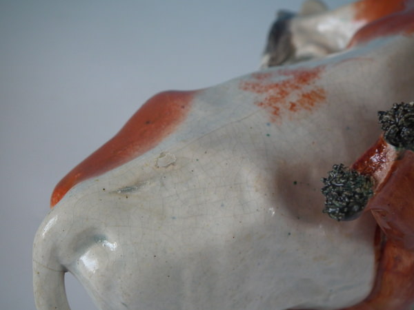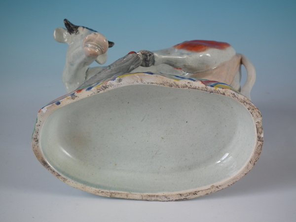 pre-Victorian, circa 1830. 7.1ins high, 6.7ins wide, 3.5ins depth. Obadiah Sherratt Staffordshire figure which features a cow