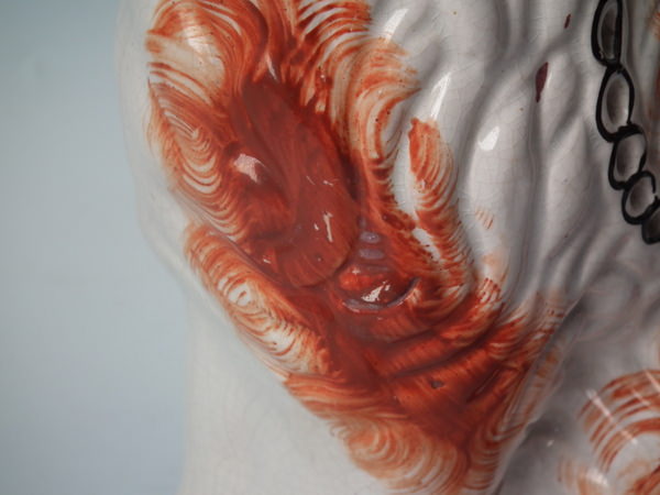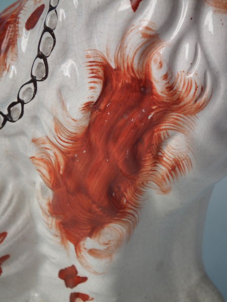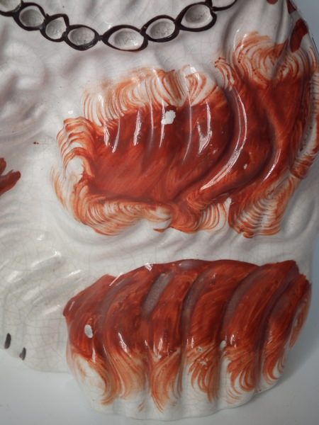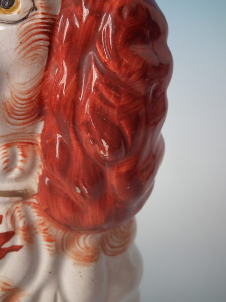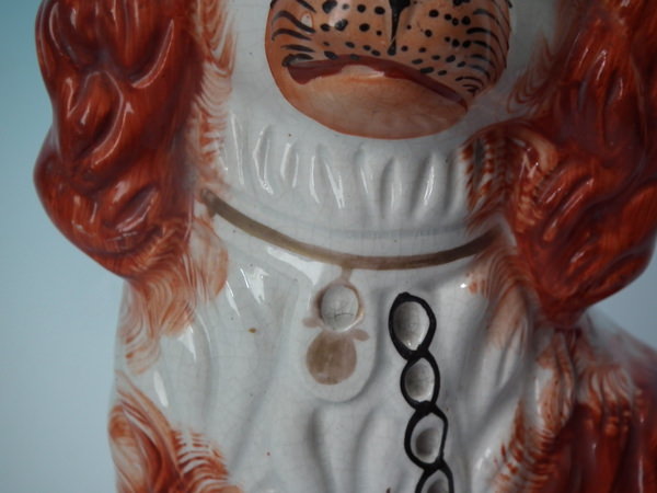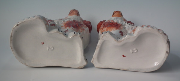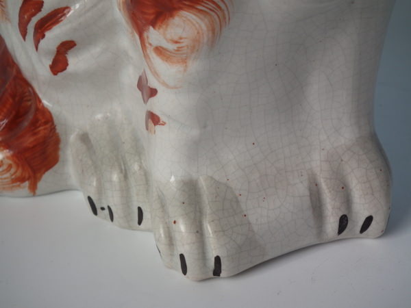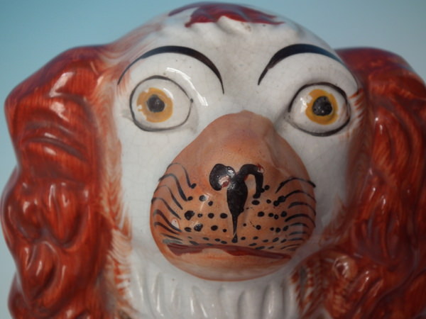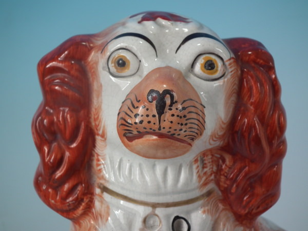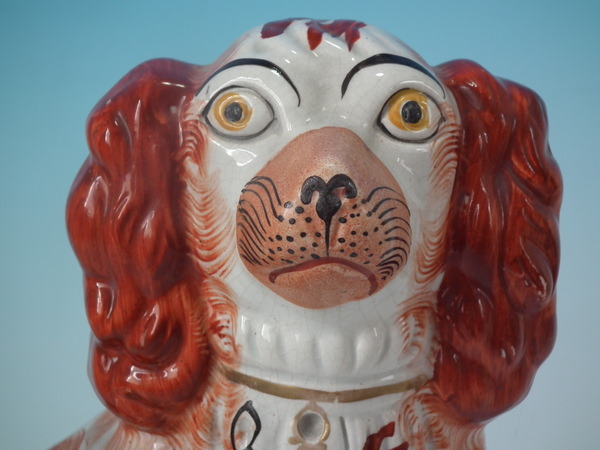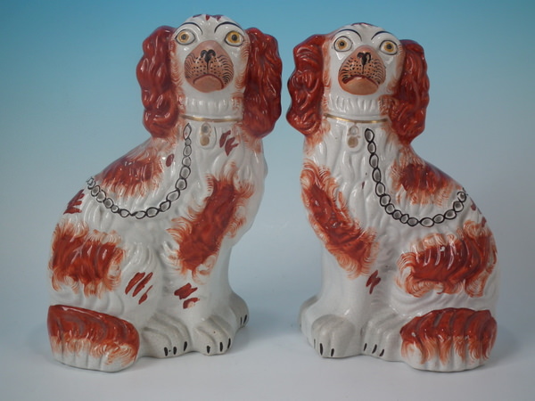 Pair of Staffordshire figures which feature a spaniel, seated directly on the ground, no base.