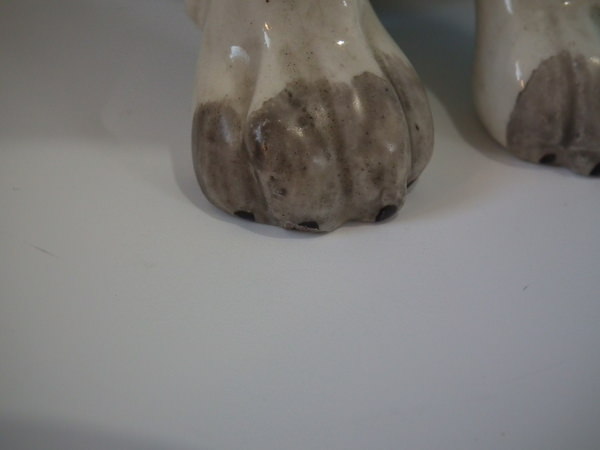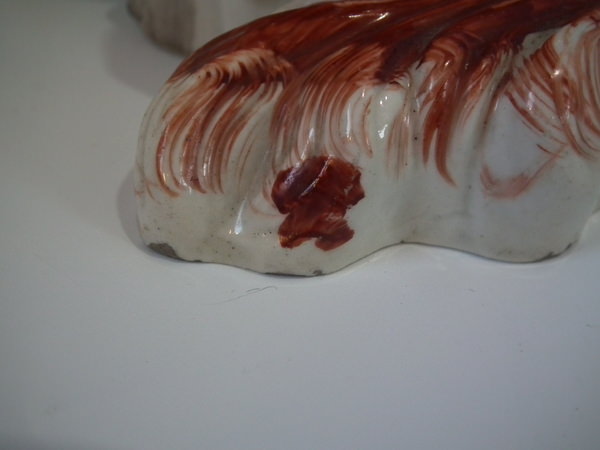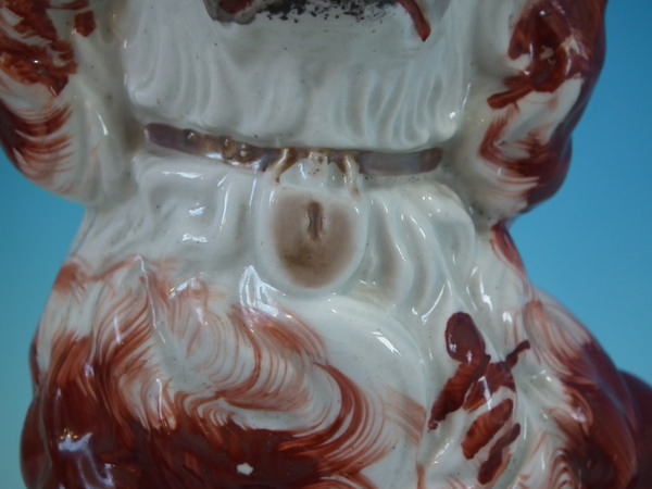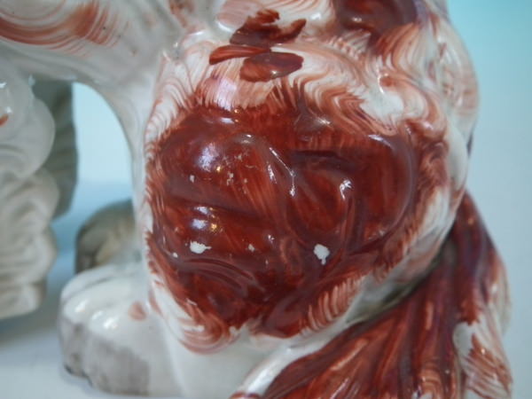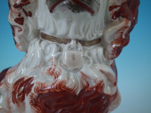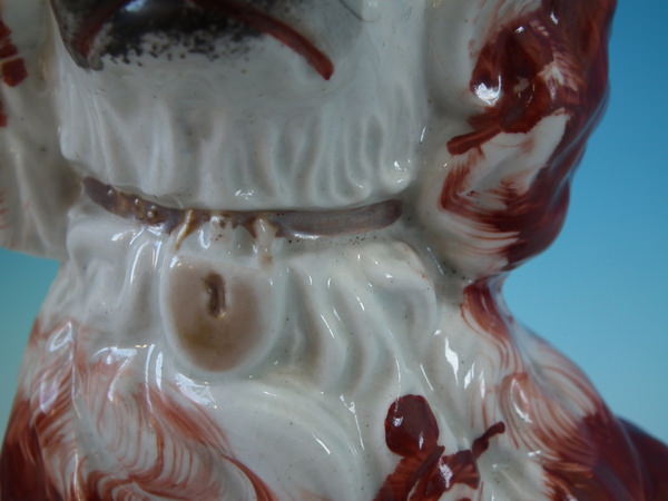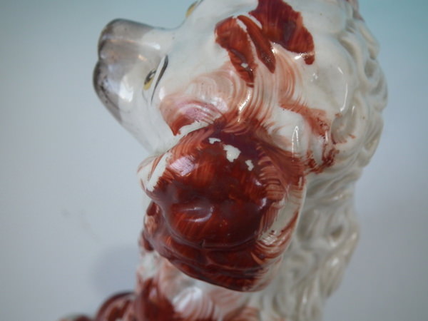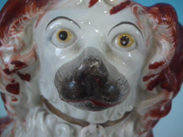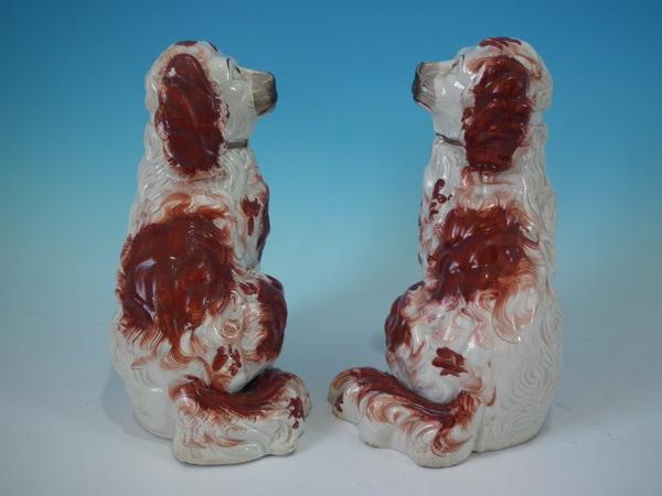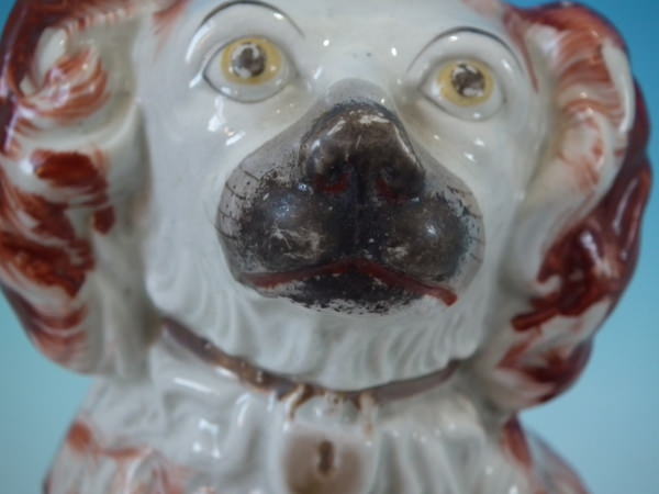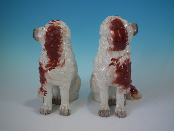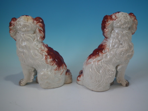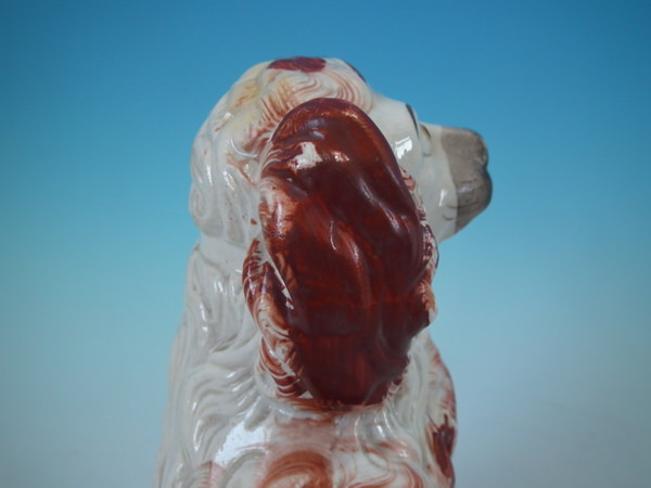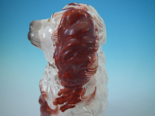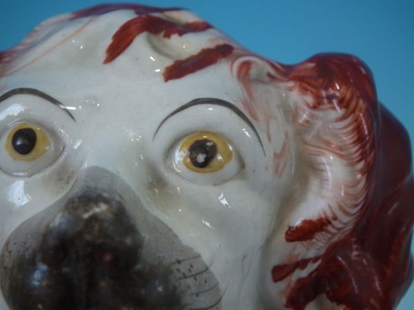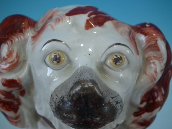 Victorian, circa 1860. Tallest is 7.9ins high, 5.5ins wide, 4.7ins depth. Pair of Staffordshire figures which feature a spaniel, with both front legs free, seated directly on the ground, no base.