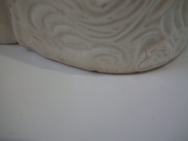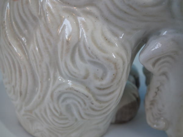 KILN EFFECTS: piece of kiln detritus caught inside causing piece to rattle; kiln soot caught in the glaze to the front and reverse.