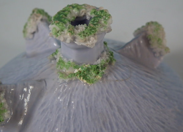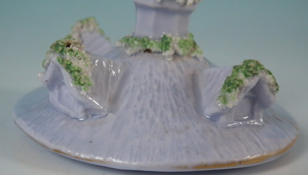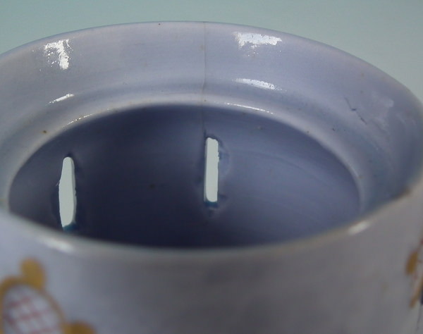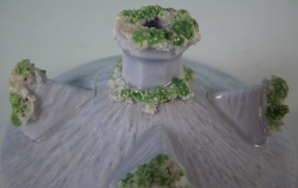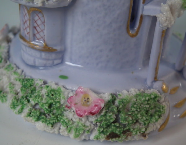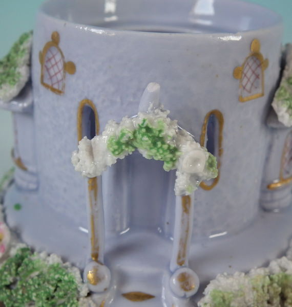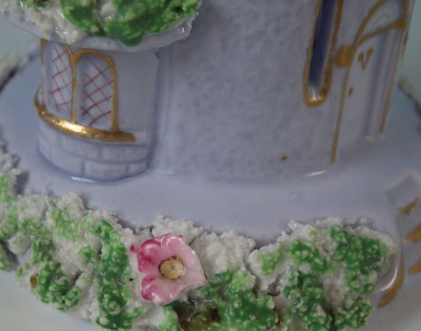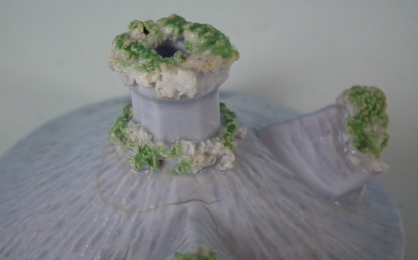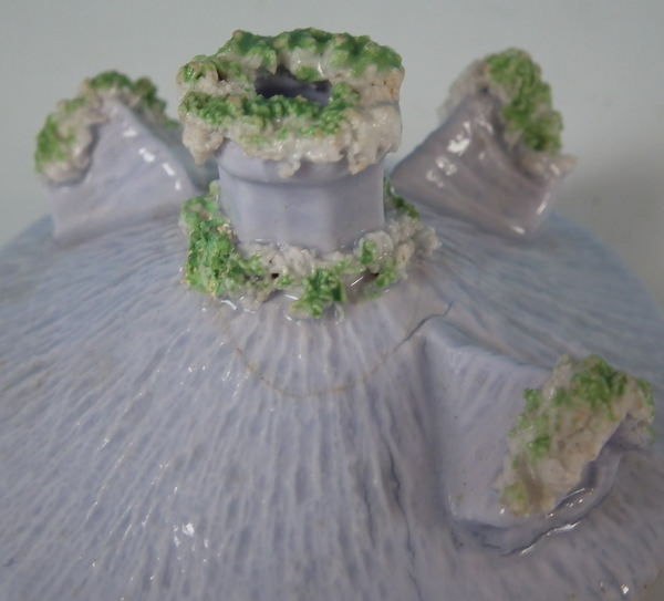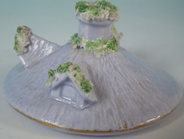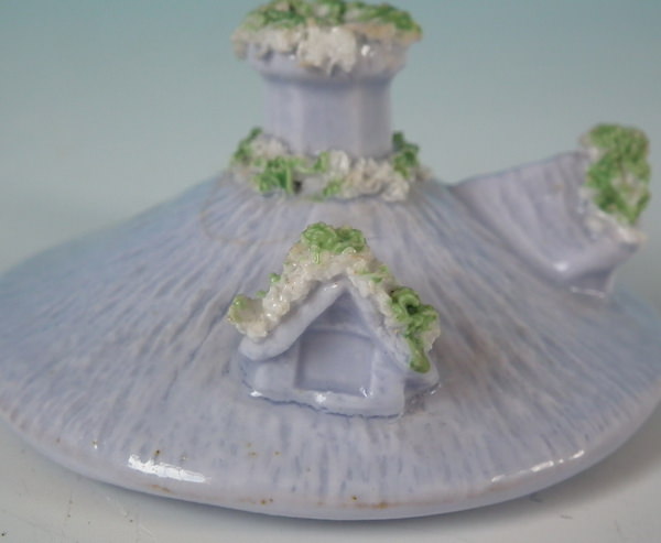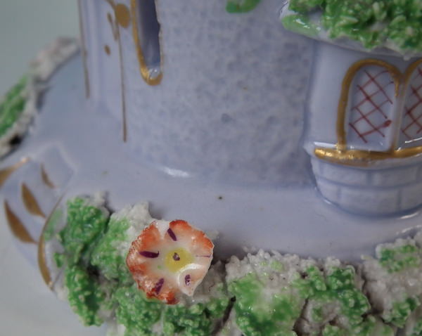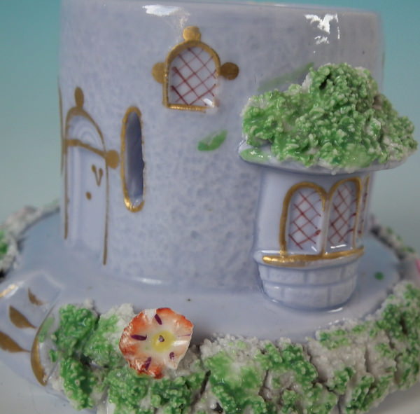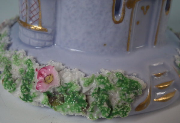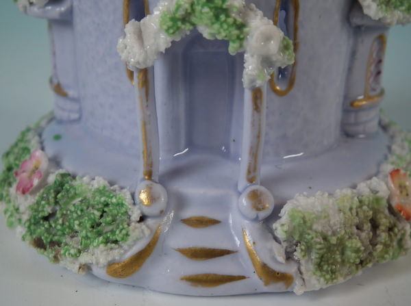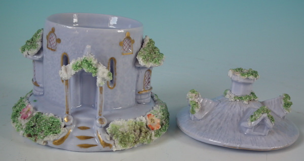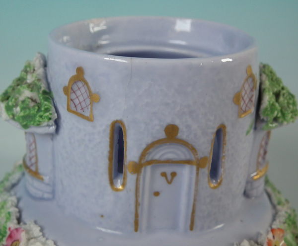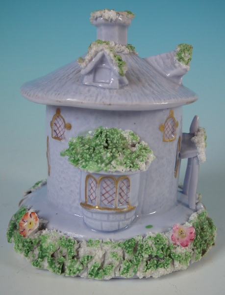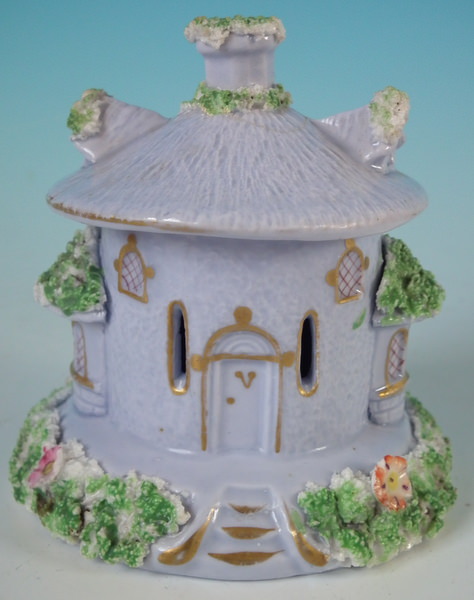 Victorian, circa 1860. 3.6ins high, 3.5ins wide, 3.5ins depth. Staffordshire pastille burner which features a round cottage with detachable lid, resting on a circular base. Lilac version. Dull gilt embellishment.