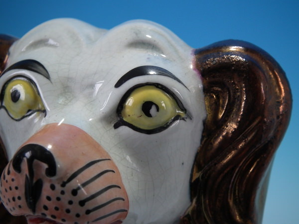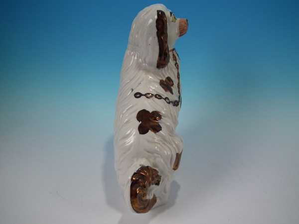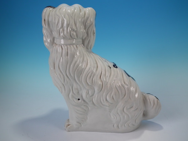 Victorian, circa 1860. 11.2ins high, 9.1ins wide, 3.5ins depth. Staffordshire figure which features a spaniel, front leg molded free, seated directly on the ground, no base.