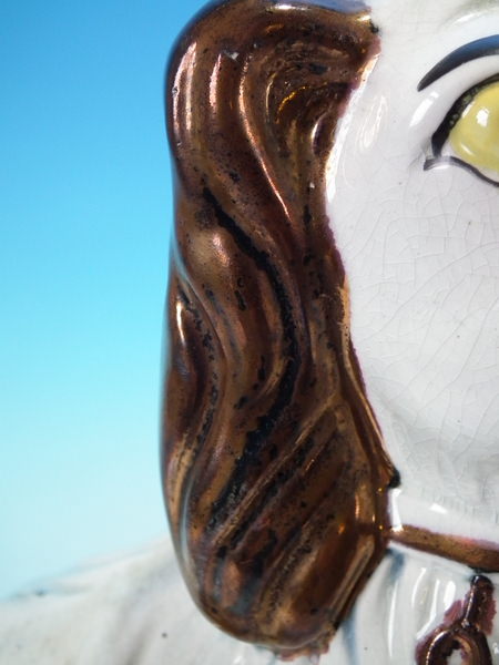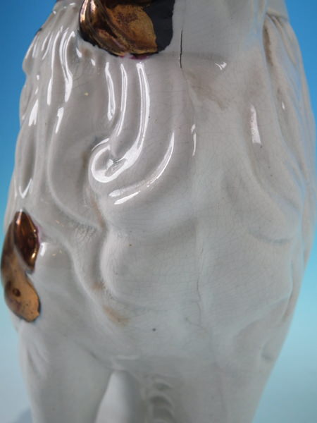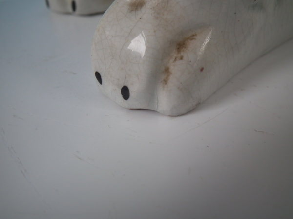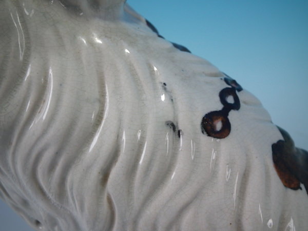 KILN EFFECTS: flecks of stray coloured glaze to the reverse and right front paw;