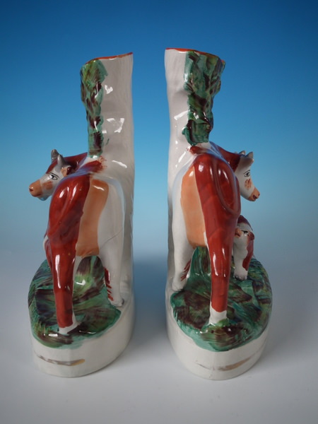 Victorian, circa 1880. Tallest is 10.7ins high, 8.1ins wide, 4.3ins depth. Pair of Staffordshire spill vases which feature a cow with