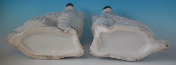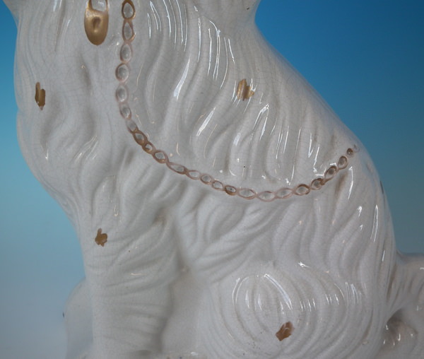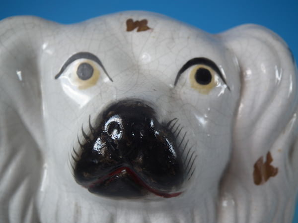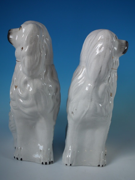 Victorian, circa 1860. Tallest is 14.6ins high, 11ins wide, 5.1ins depth. Pair of Staffordshire figures which feature a spaniel, seated directly on the ground, no base. Dull gilt collar and locket.