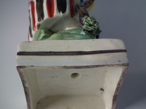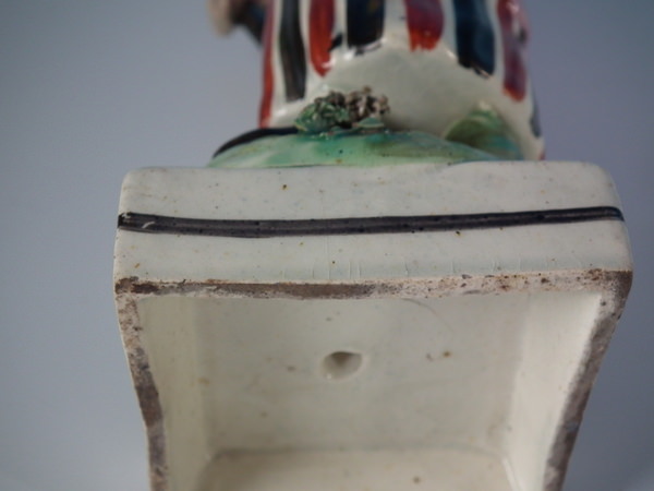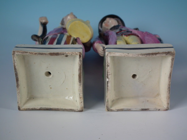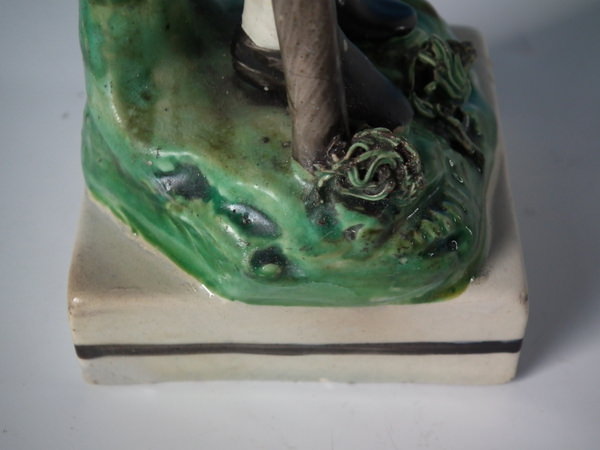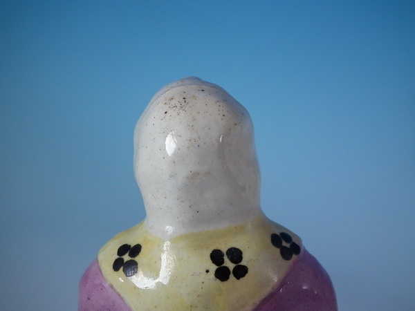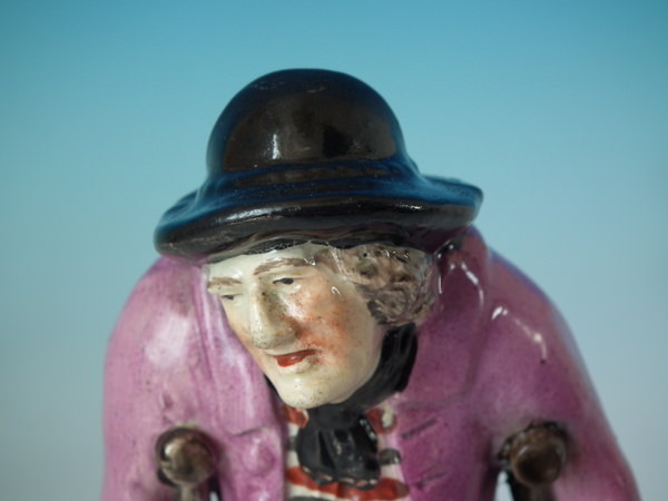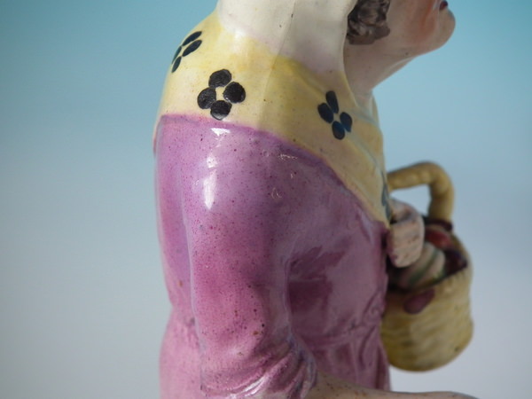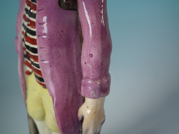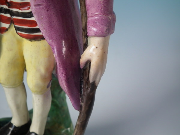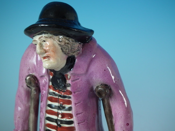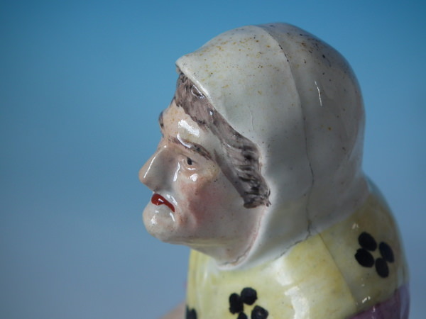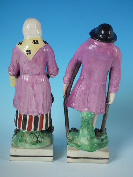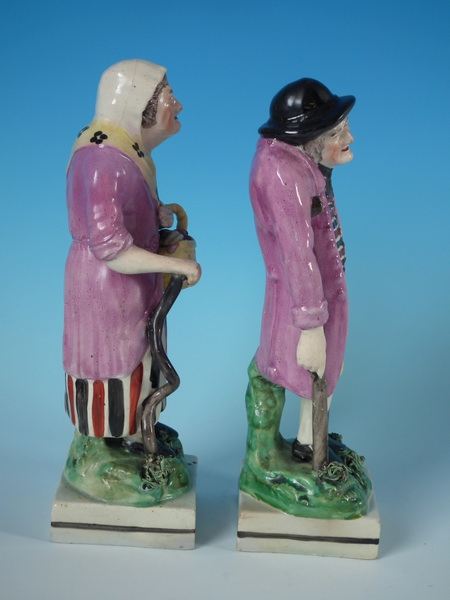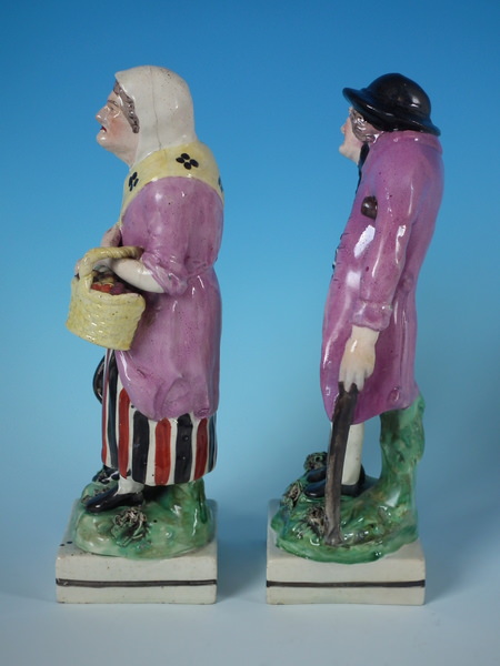 pre-Victorian, circa 1820. Tallest is 8.7ins high, 3.3ins wide, 2.6ins depth. Pair of Staffordshire pearlware figures which feature an elderly lady and gentleman,