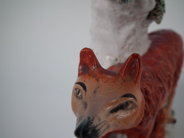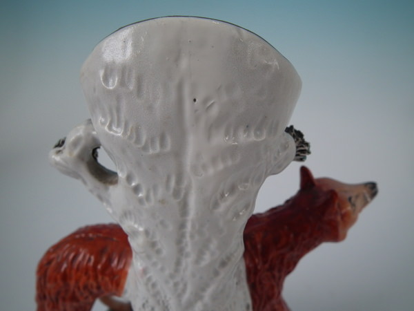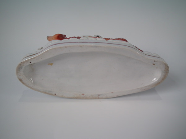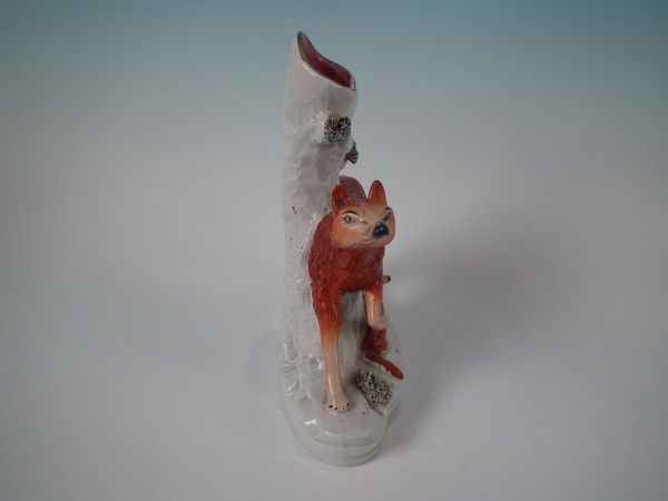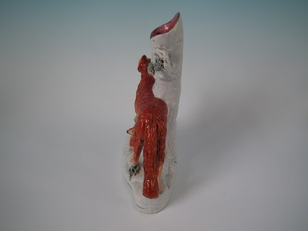 Victorian, circa 1860. 7.5ins high, 6.7ins wide, 2.8ins depth. Staffordshire spill vase which features a wolf with its cub, stood on an oval base.