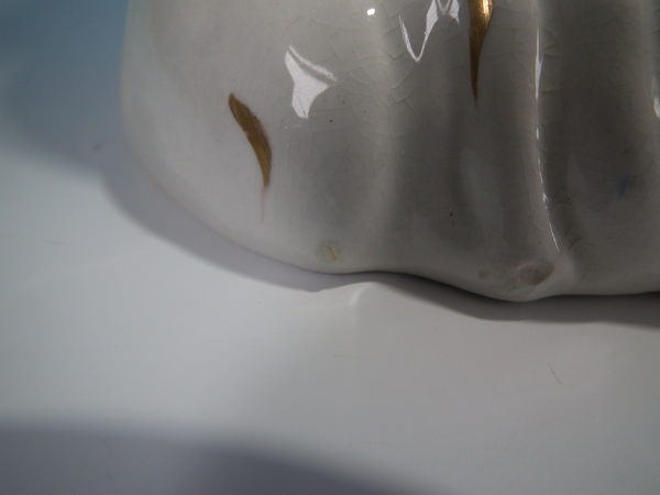 White and gilt version. Dull gilt embellishment. Flatback, decorated only to the front. Vent hole to the reverse.