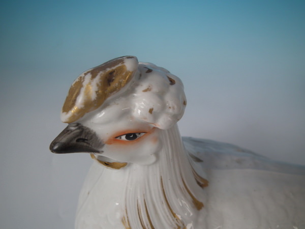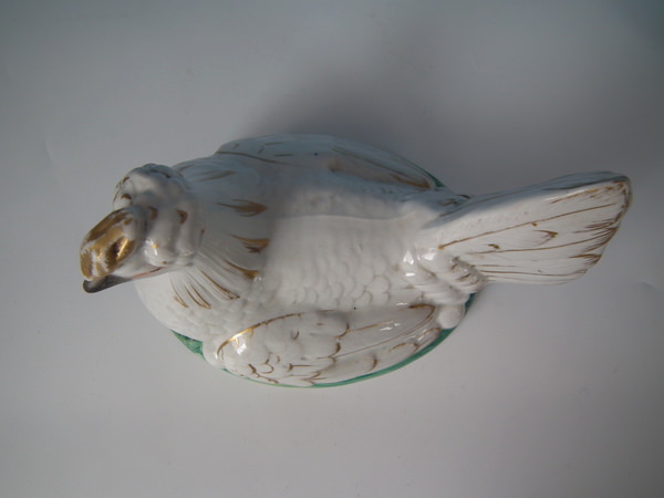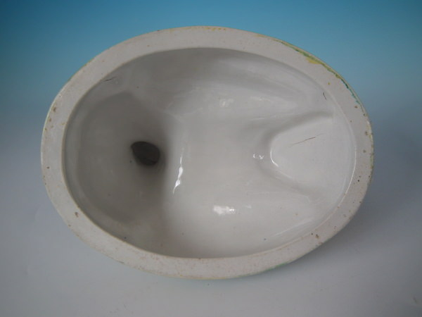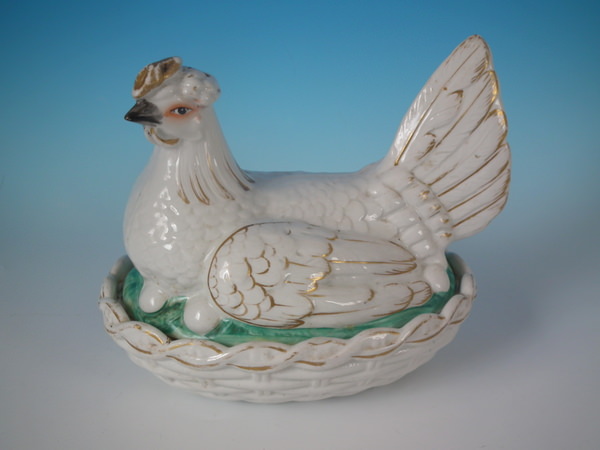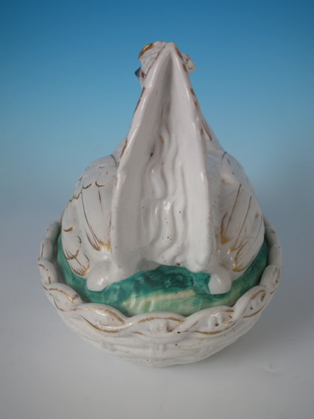 Victorian, circa 1860. 7.5ins high, 8.7ins wide, 6.3ins depth. Staffordshire tureen with cover which features a hen sitting on her eggs,