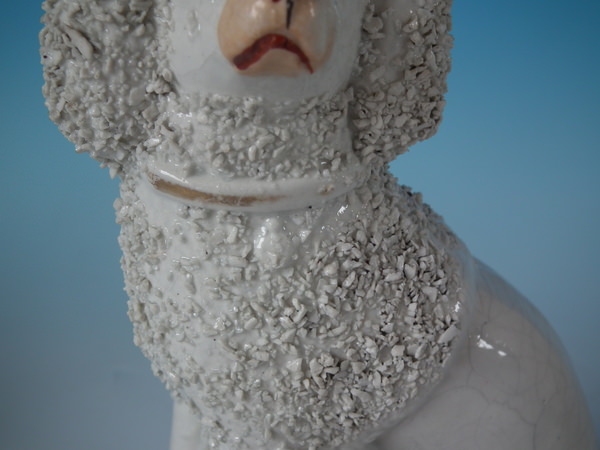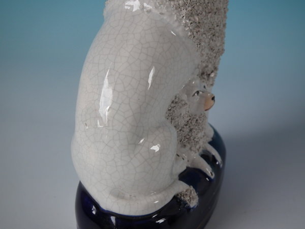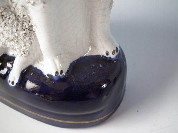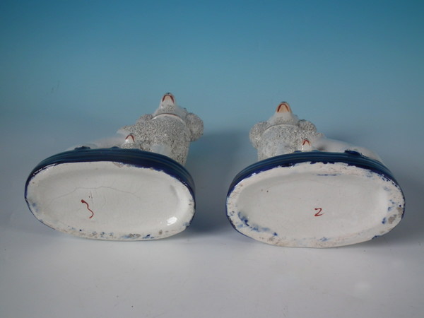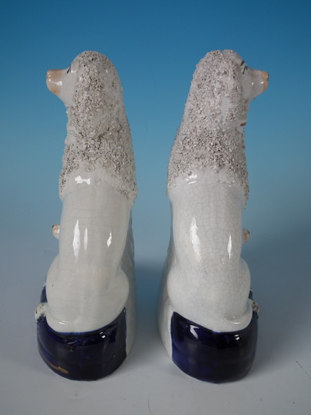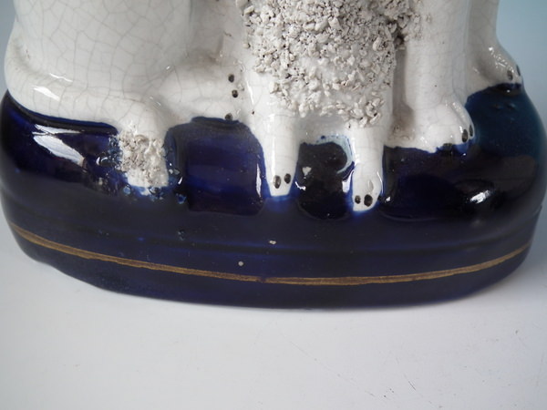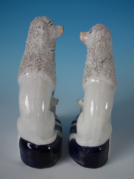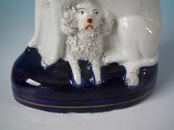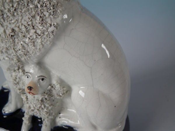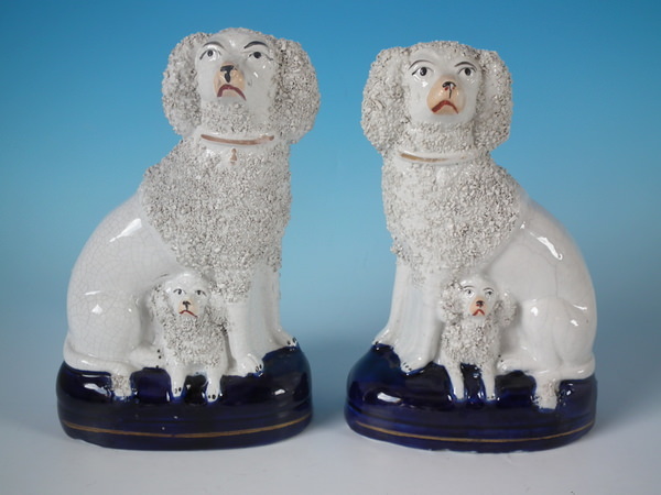 Victorian, circa 1860. Tallest is 7.1ins high, 4.6ins wide, 2.5ins depth. Pair of Staffordshire figures which feature a poodle and pup, seated on a cobalt blue base.