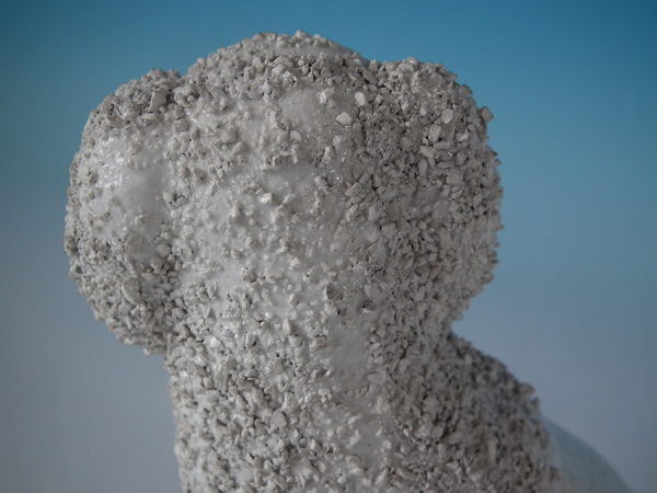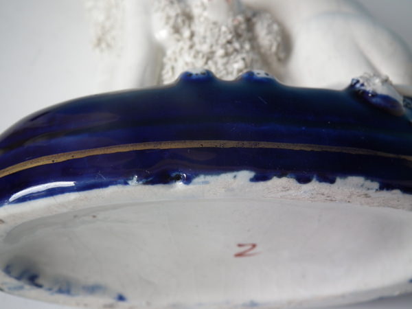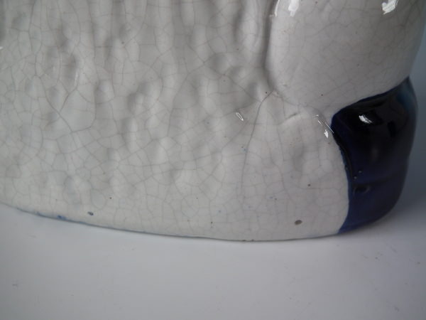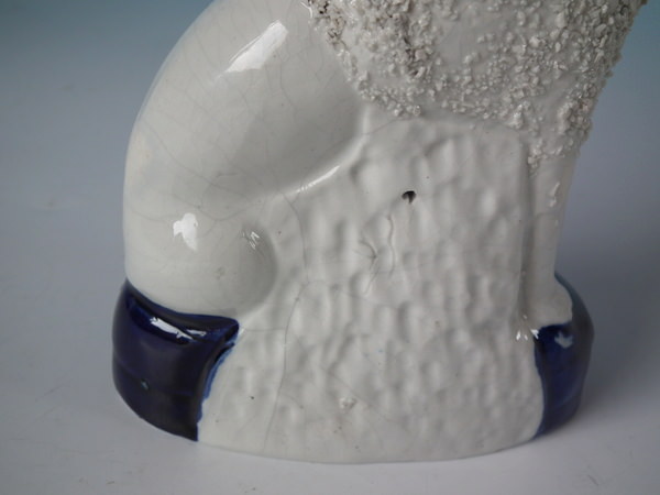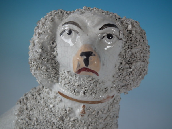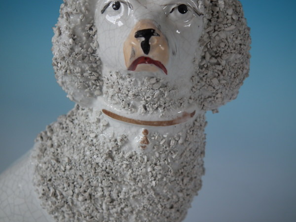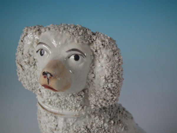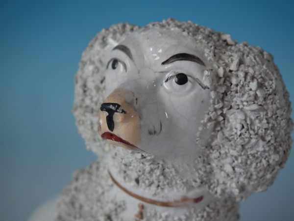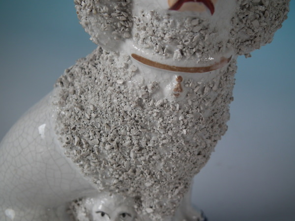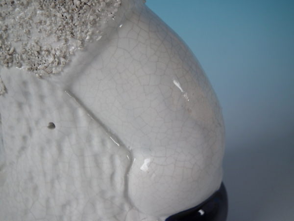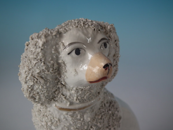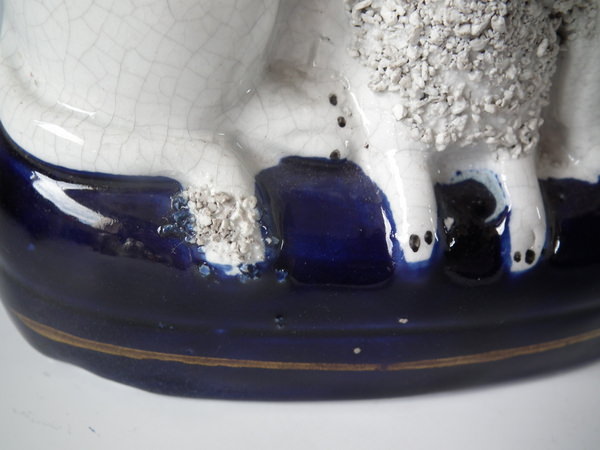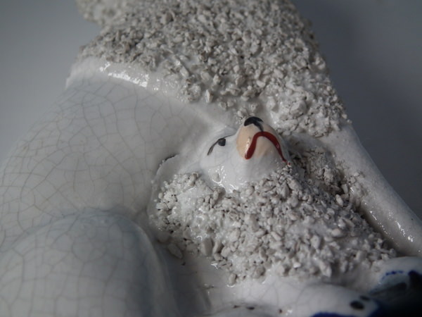a few specks of kiln detritus caught in the glaze to the base and poodle's face;