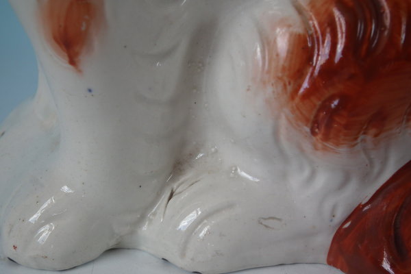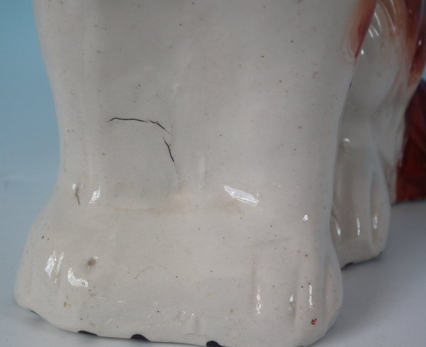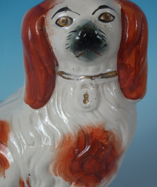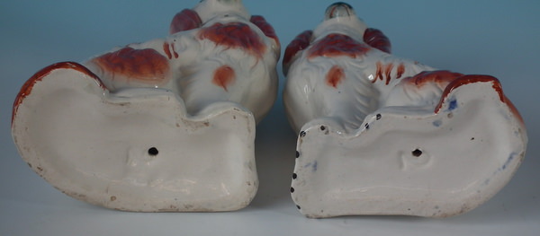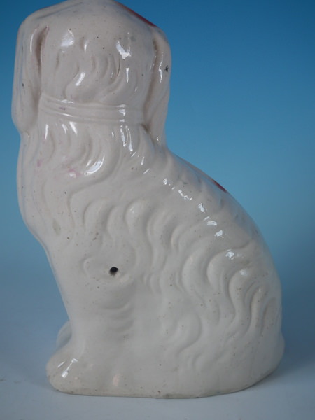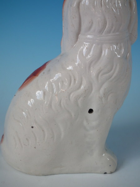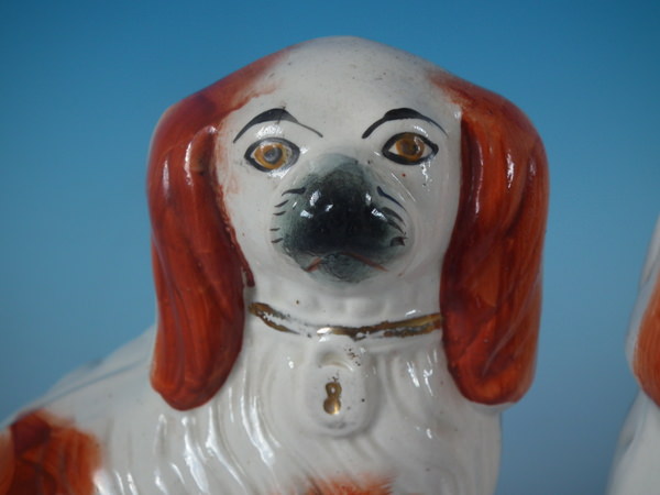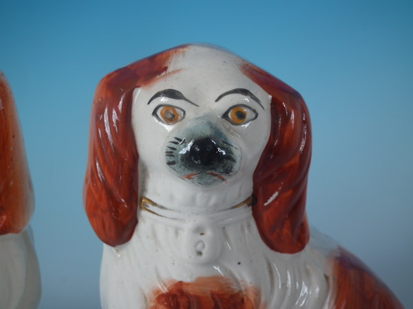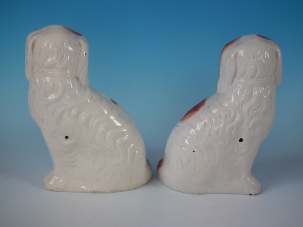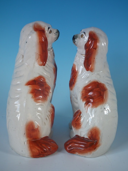 Victorian, circa 1890. Tallest is 7.9ins high, 5.5ins wide, 3.5ins depth. Pair of Staffordshire figures which feature a spaniel, seated directly on the ground, no base. Bright gilt embellishment.